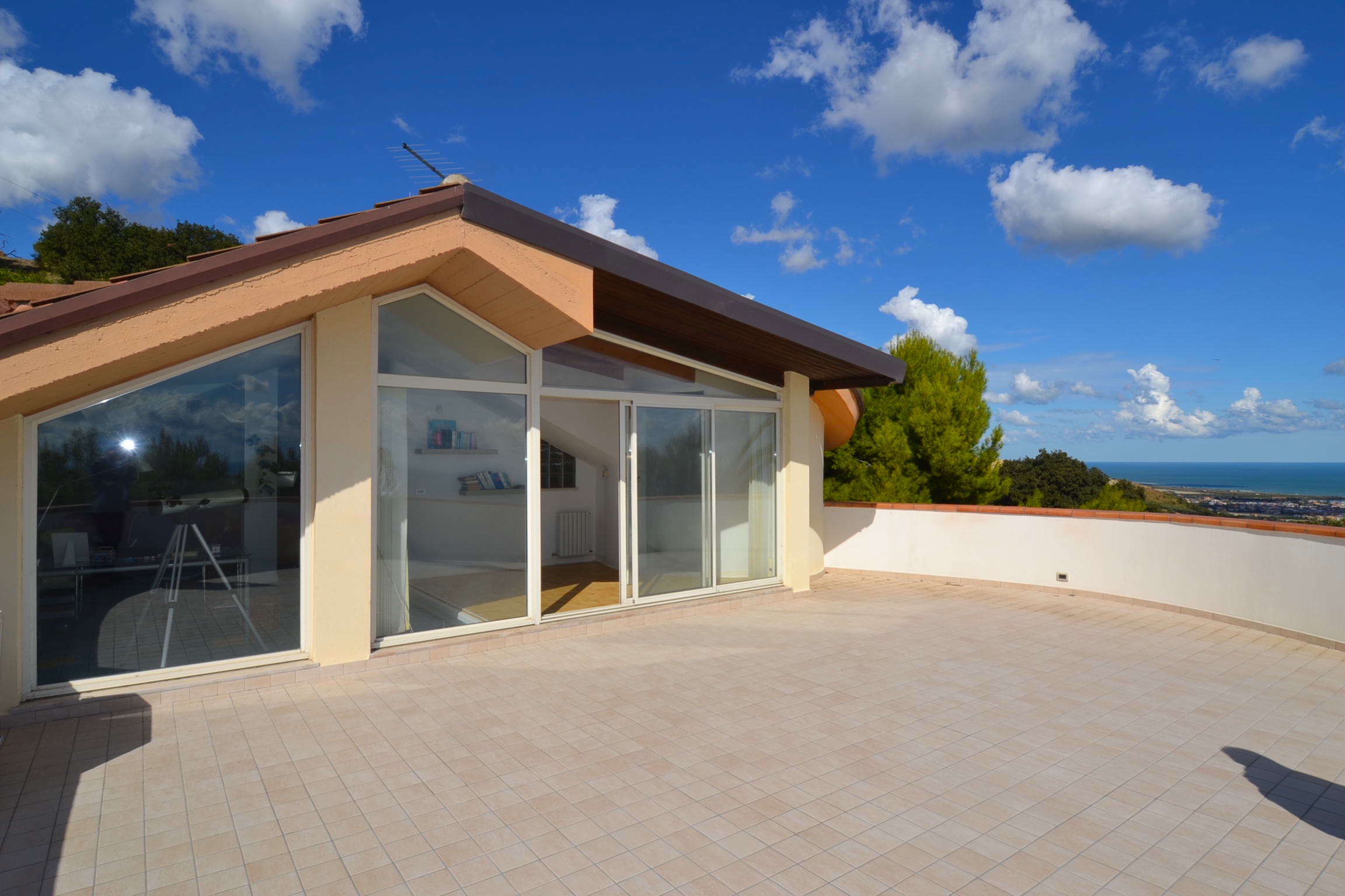 il piano primo, anch'esso delle dimensioni di 100 mq circa, ospita un appartamento completo, con ingresso su ampio soggiorno, una cucina abitabile, due camere da letto matrimoniali, due bagni ( di cui uno interno ad una camera da letto ); completa il piano ampie balconate esterne di dimensioni sufficienti anche per potervi comodamente soggiornare nella bella stagione; Attraverso la medesima scala interna , si accede al piano ultimo, dove troviamo un suggestivo attico di circa 80 mq, con un ampio soggiorno con angolo cottura, due stanze da letto ed un bagno, oltre ad una splendida terrazza panoramica di oltre 60 mq circa, con una stupefacente vista del mare e della costa, oltre che affaccio sullo splendido parco privato della villa stessa.