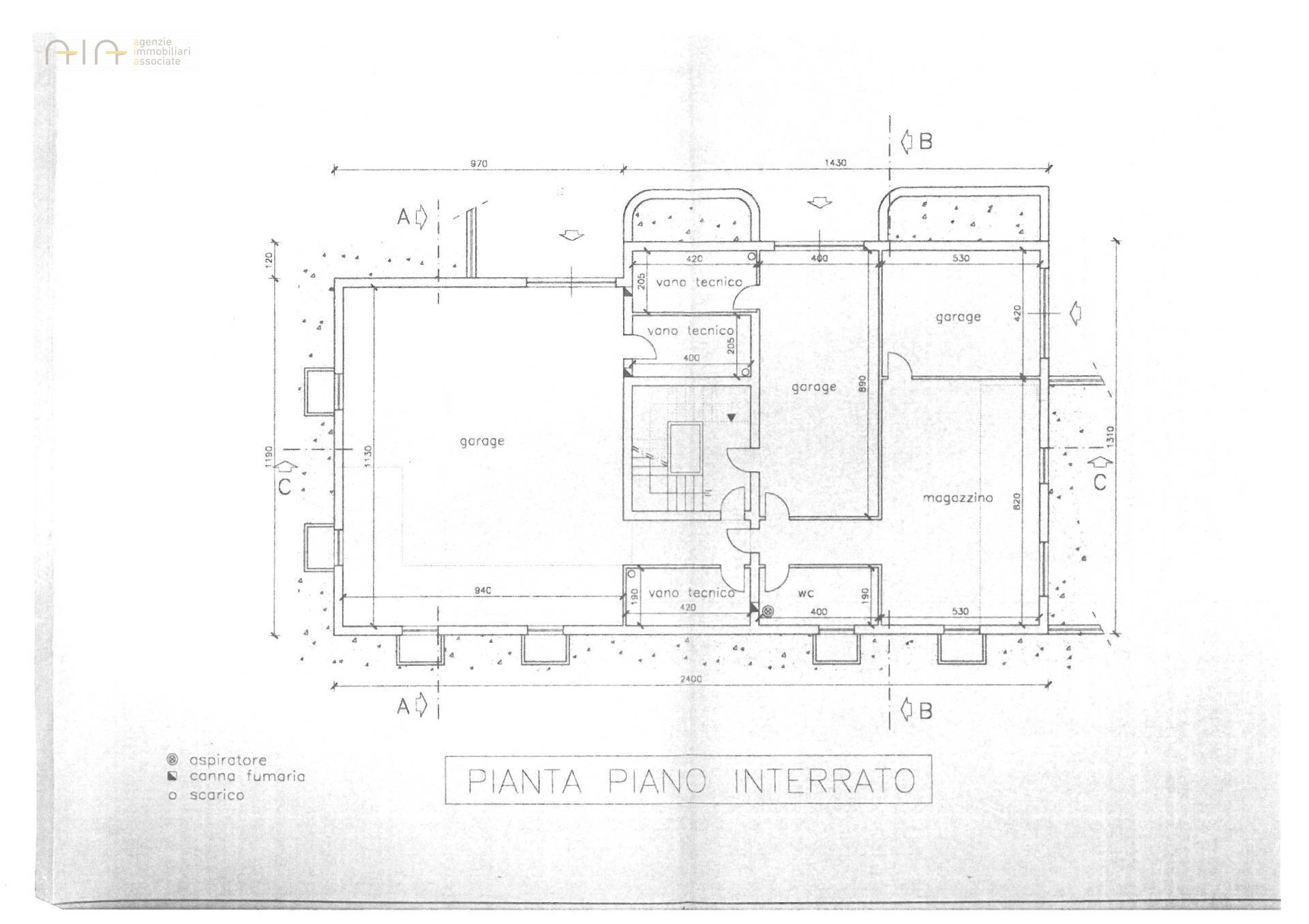 - Piano seminterrato della superficie di mq 302 circa, destinato a locali garage e servizi vari, in parte finestrati;