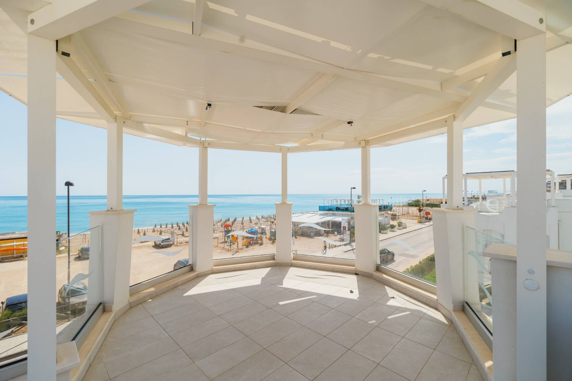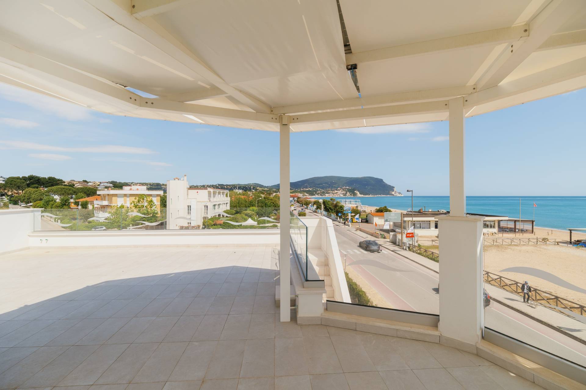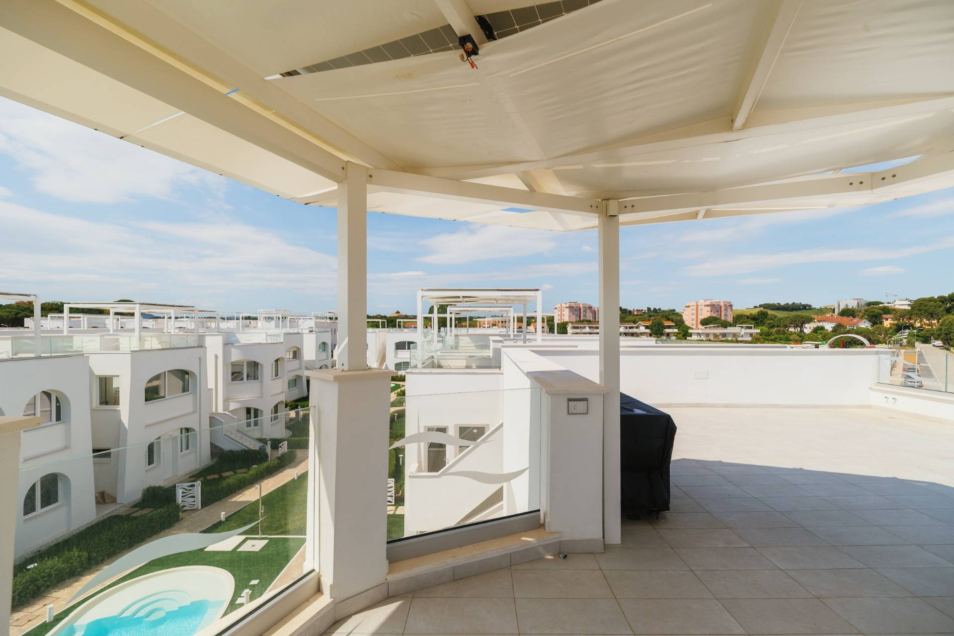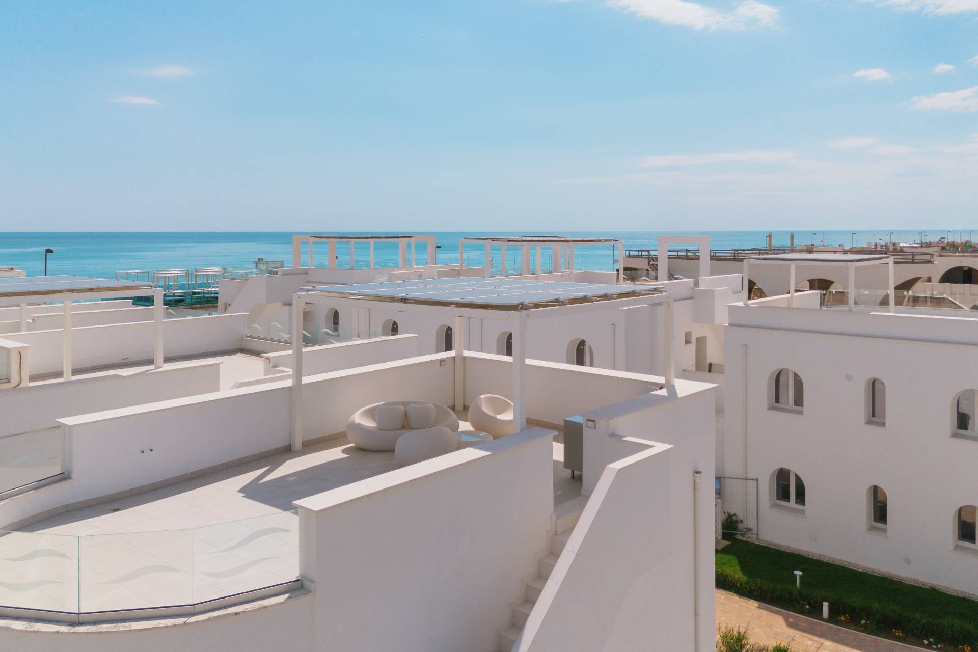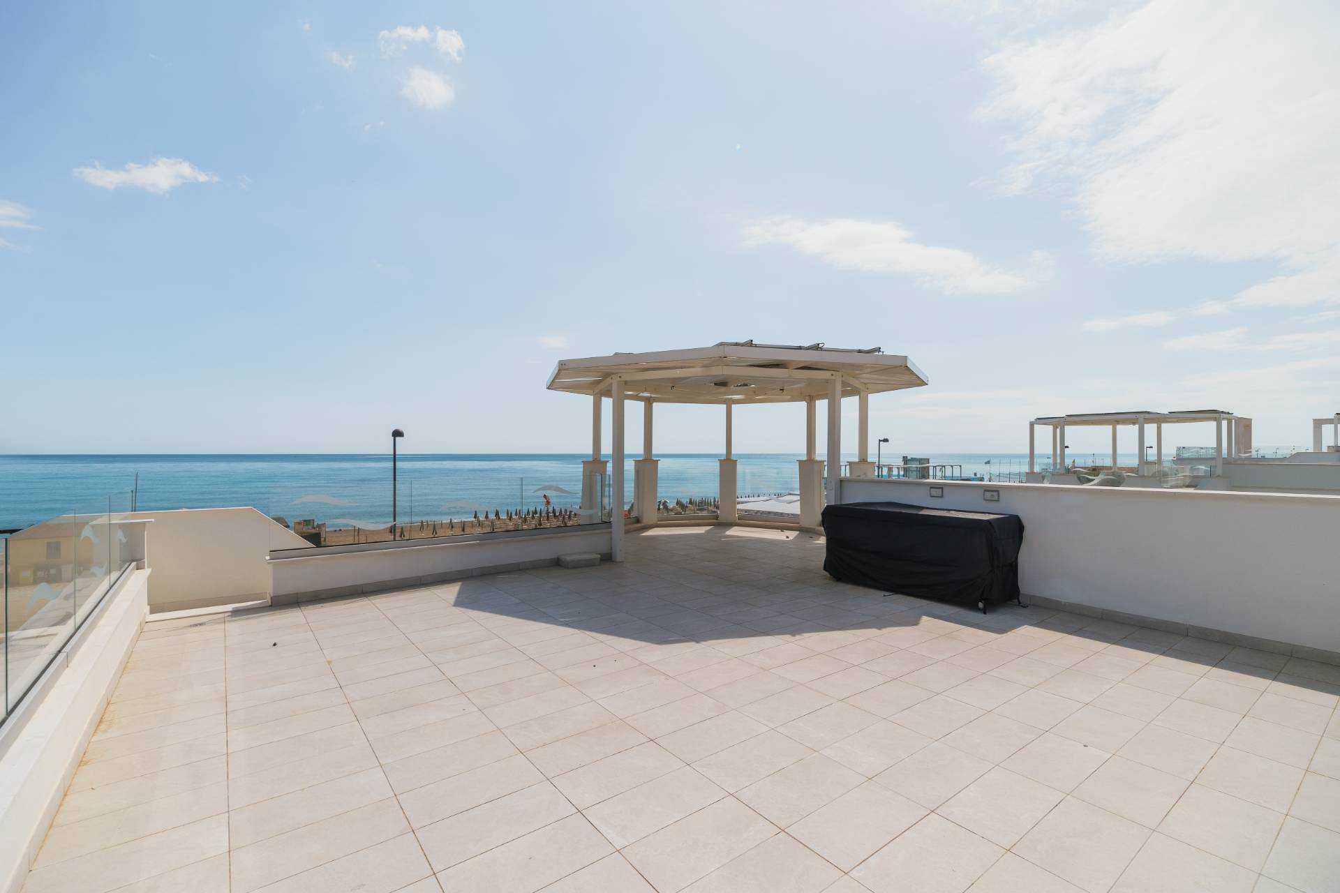 - Piano secondo con meravigliosa terrazza solarium privata al piano superiore delle dimensioni di 78 mq circa, con vista del mare, allestita con cucina all'aperto e gazebo ombreggiante.