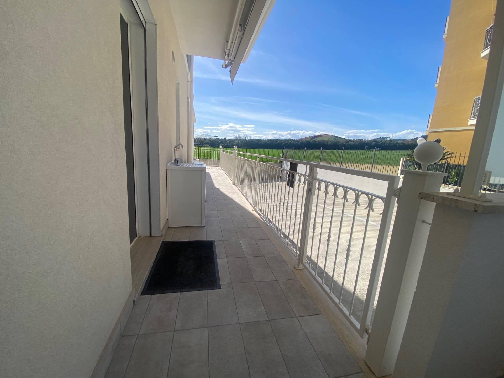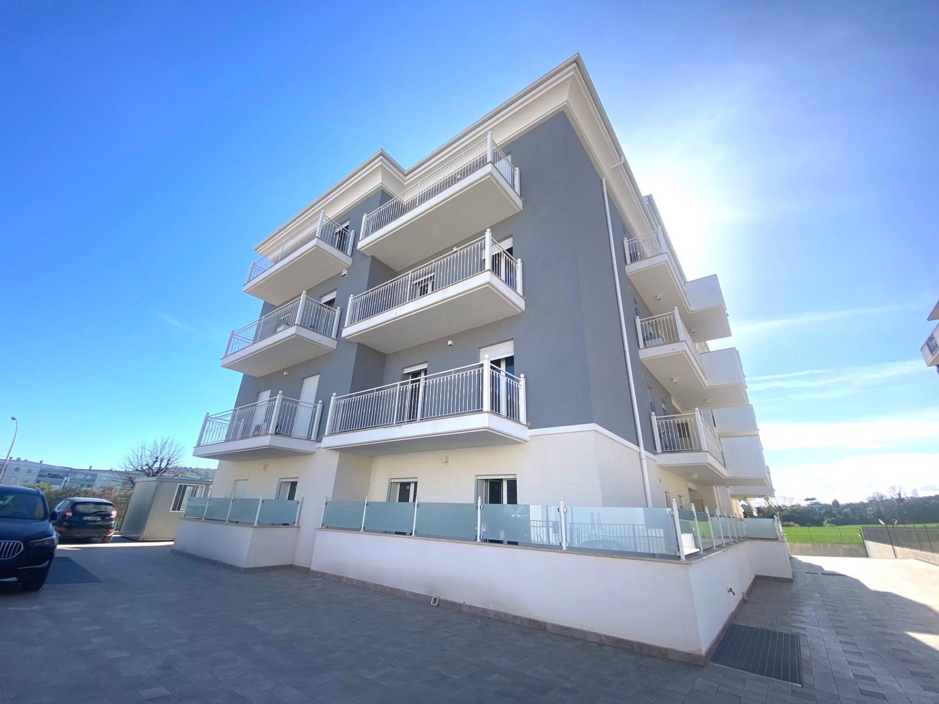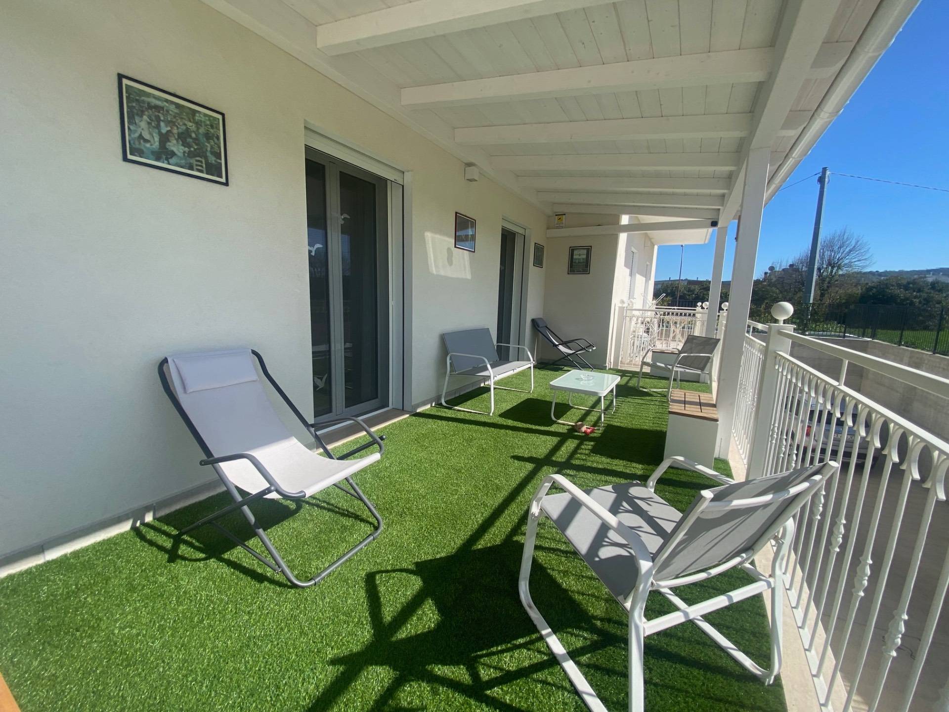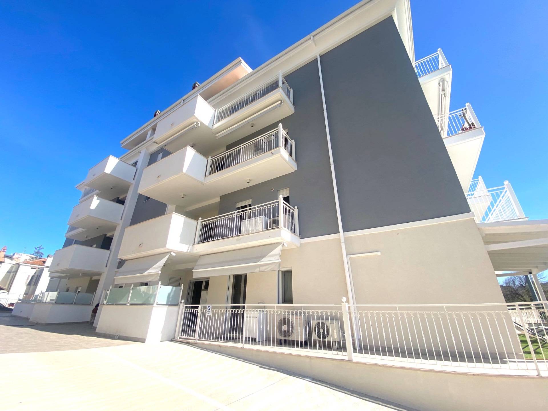 Appartamento per civile abitazione in classe A4 di circa 94 mq sito al piano terreno di elegante palazzina di recente costruzione (2022) composto da ingresso su soggiorno con angolo cottura separato, disimpegno, tre camere da letto (di cui una matrimoniale, una doppia ed una singola) e due bagni (uno principale finestrato con doccia e l'altro di servizio con areazione forzata) oltre ampia corte/terrazza esterna abitabile di 50 mq. circa in parte coperta da tettoia in legno e fornita di ingresso indipendente all'Appartamento. L'Appartamento, pari al nuovo, presenta pavimentazione in grès porcellanato su tutta la superficie, infissi in alluminio con doppio vetro e zanzariere, portone blindato, impianto di allarme, videocitofono, VMC, impianto di riscaldamento a pavimento e di raffreddamento con climatizzatori a soffitto, tede da sole elettriche telecomandate.