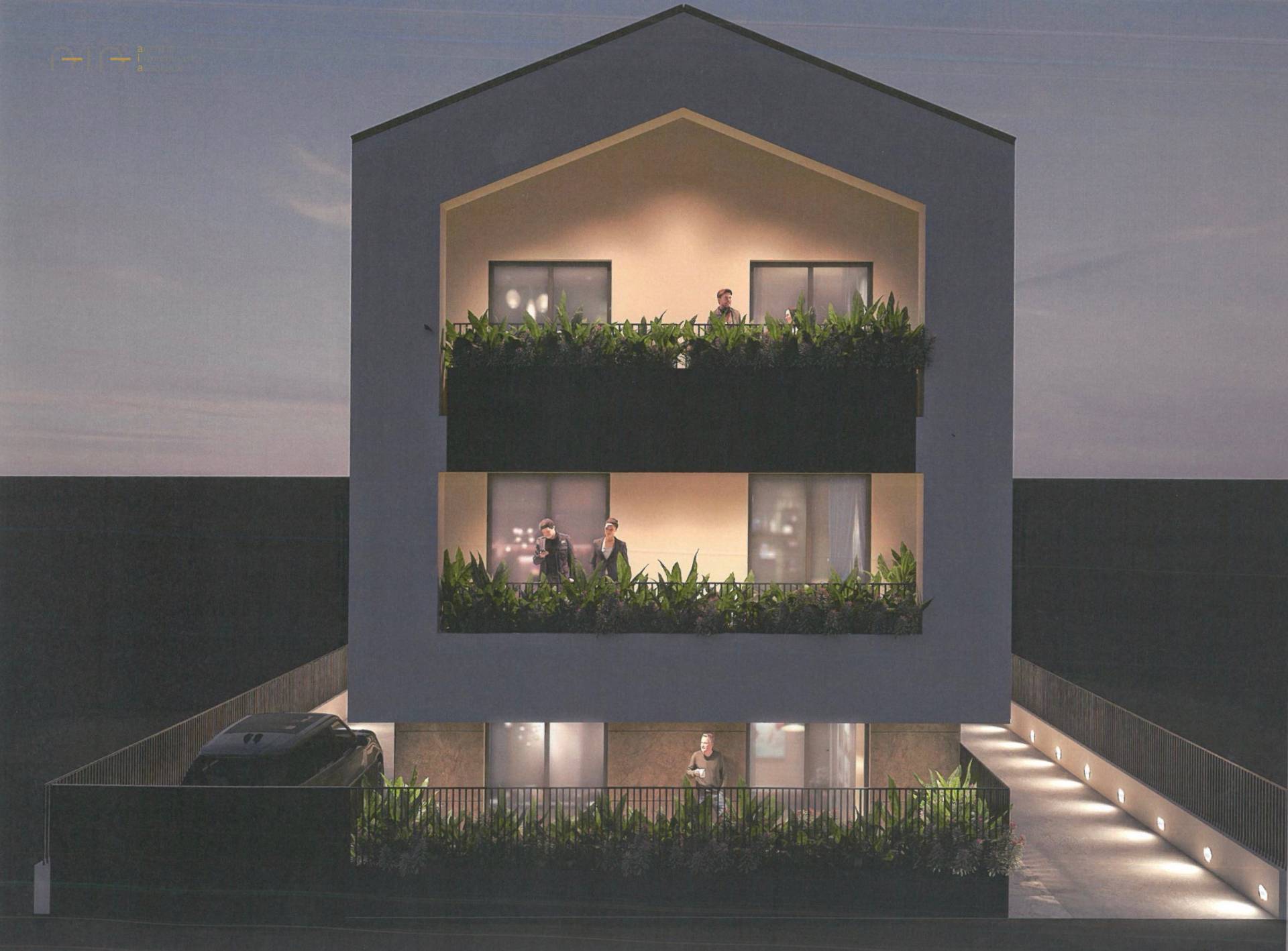 Appartamento di nuova costruzione sito al piano primo delle dimensioni di 110 m² circa, con ascensore, composto da ingresso su ampio soggiorno con zona cucina, tre camere da letto (una matrimoniali e due camere), due bagni, due balconi di 27 mq circa (con fioriere e lavandino), lavanderia e ripostiglio. Completa la proprietà un garage di 18 mq circa.