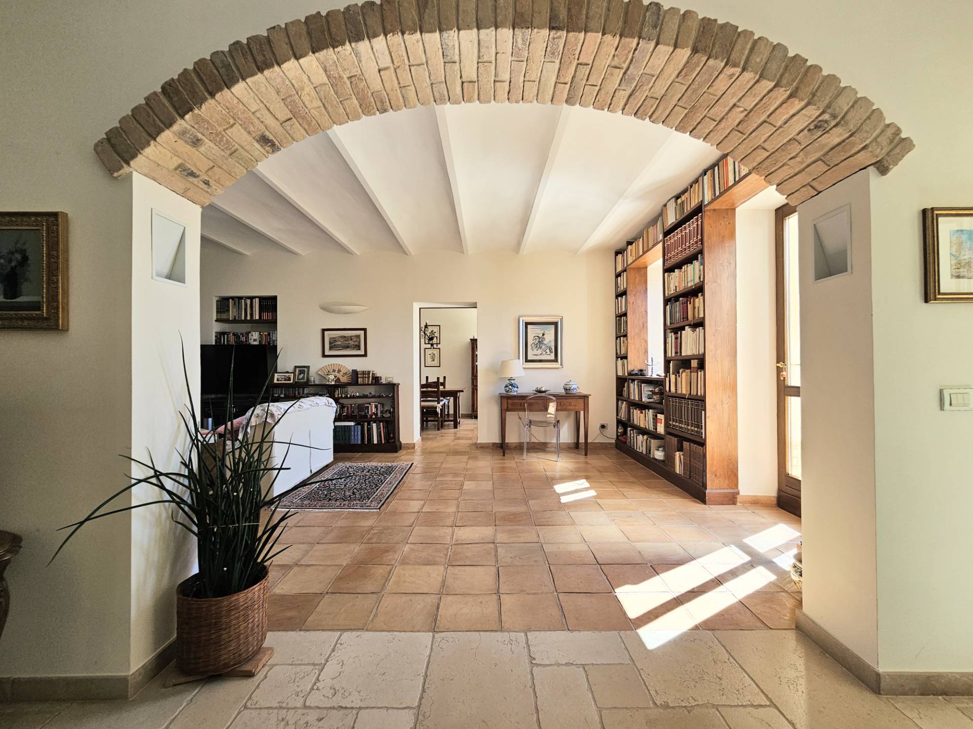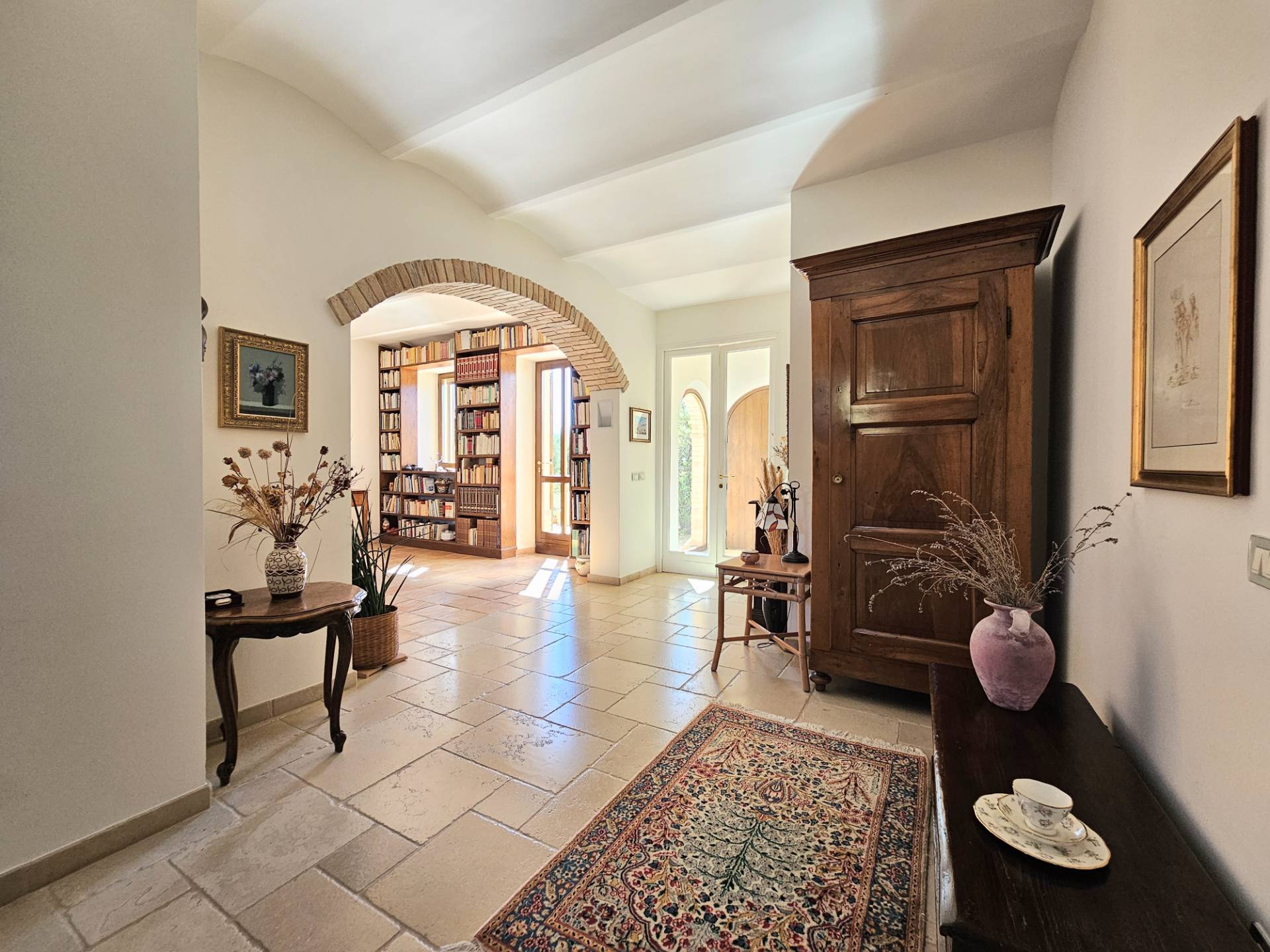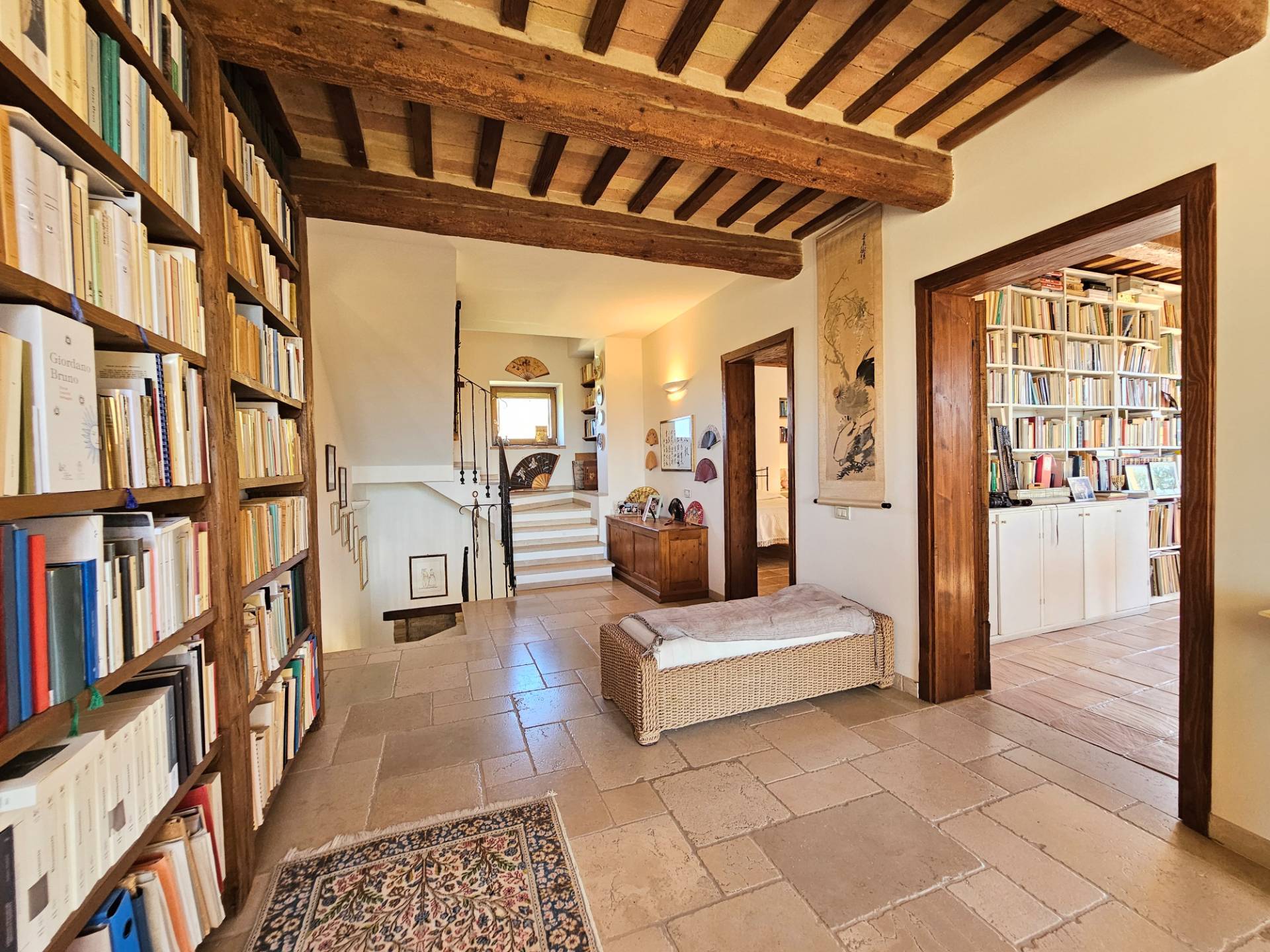 Mediante scala interna ed esterna è possibile raggiungere il piano primo dove sarete accolti da un meraviglioso ed elegante ingresso fornito anch'esso di bellissime librerie in legno su misura.