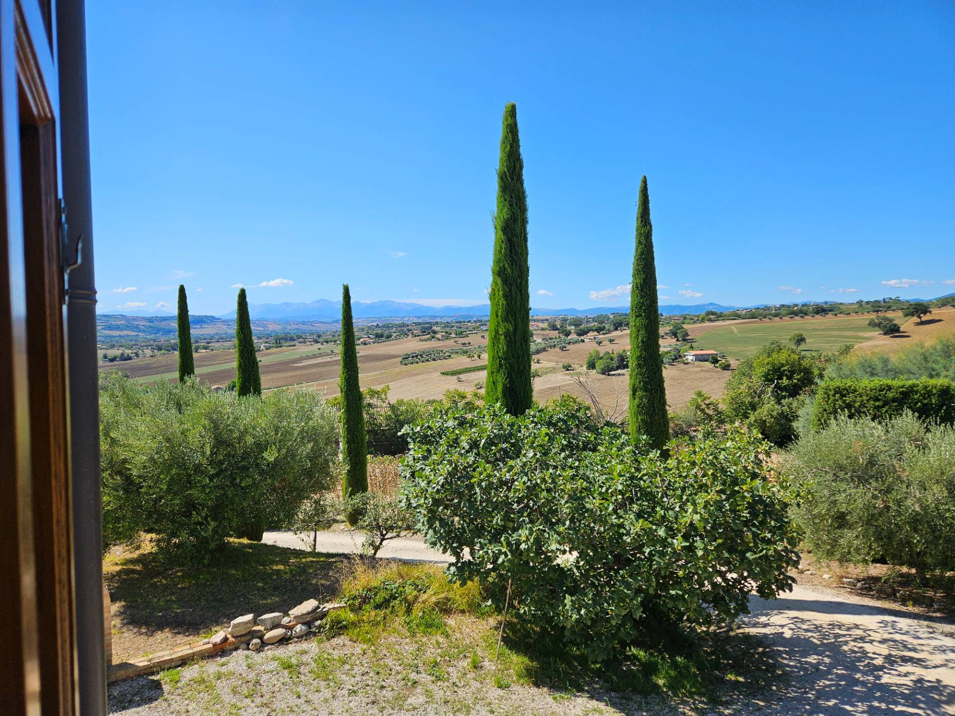 Il panorama si estende sulle valle sottostante fino ad arrivare alla città di Macerata, mentre sullo sfondo spiccano i meravigliosi Monti Sibillini.