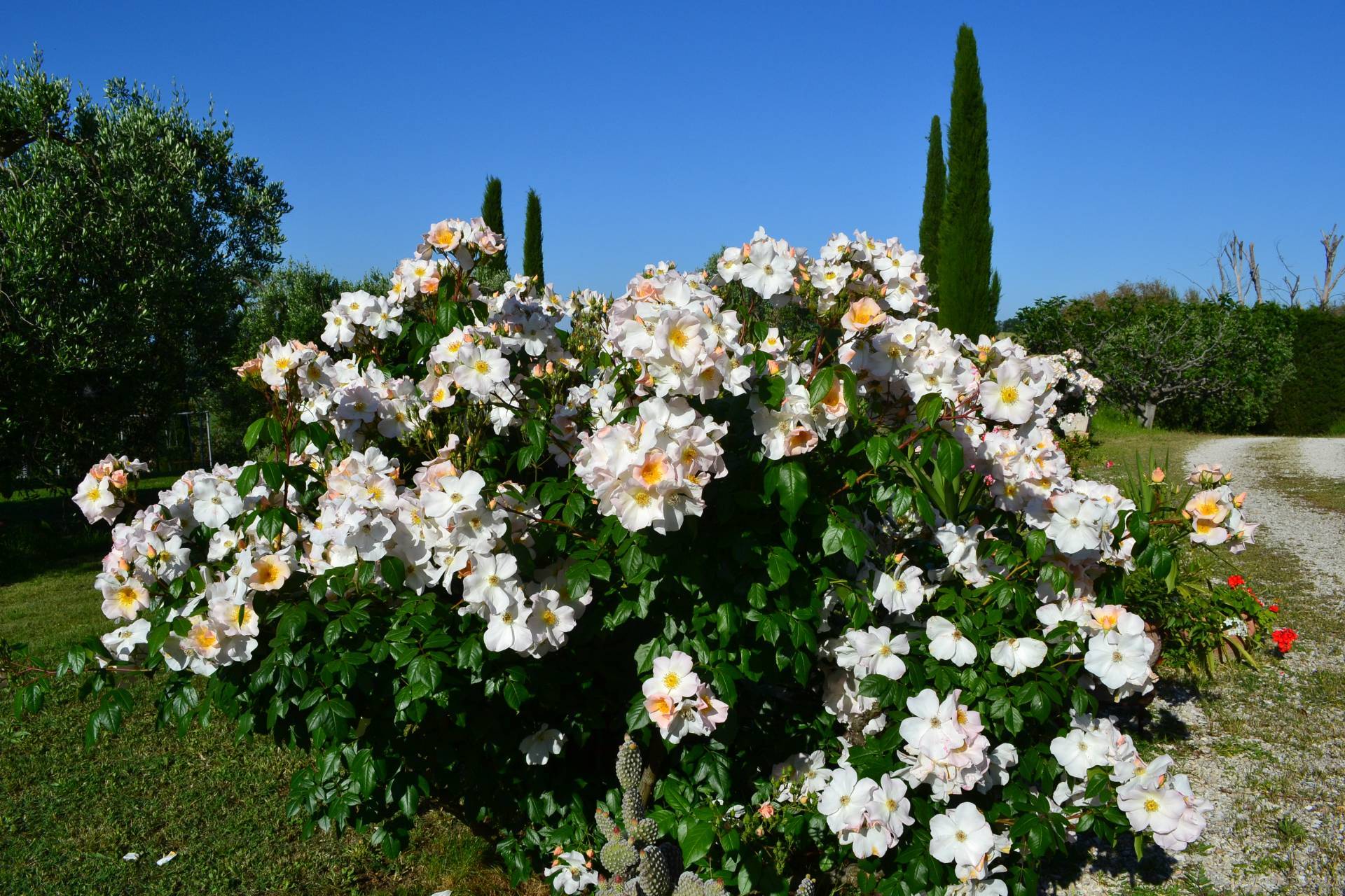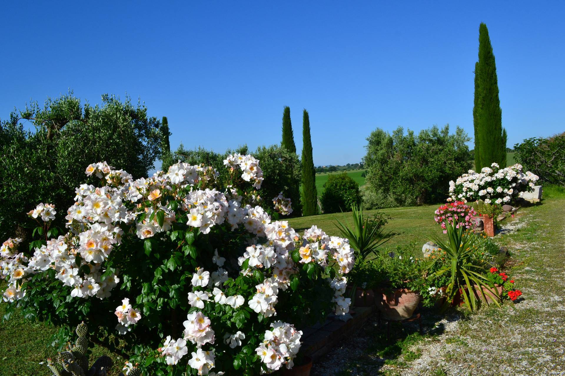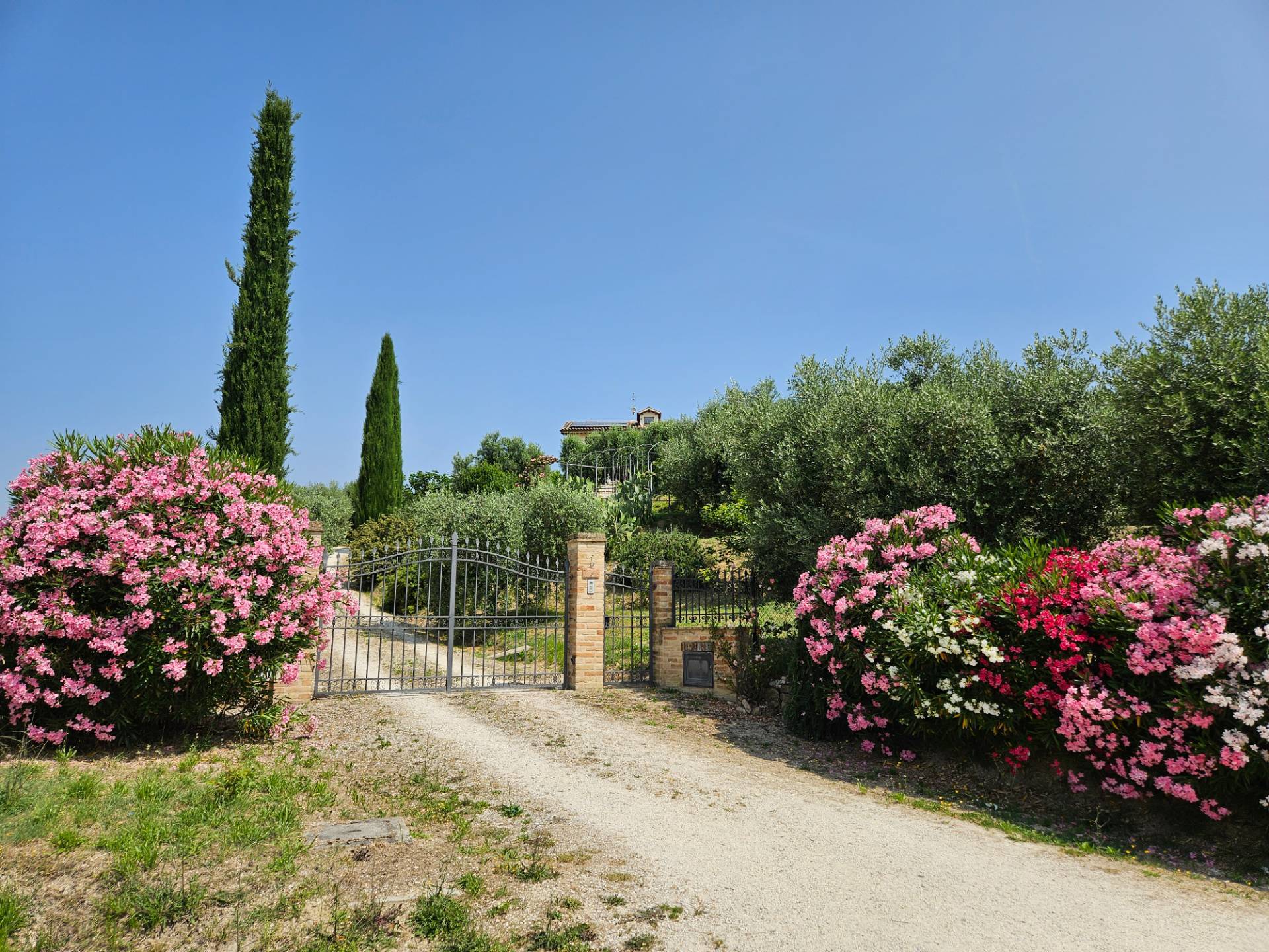 Un elegante ingresso con cancello in ferro battuto, conduce ad un viale alberato con grandi cipressi che si apre alla vista del casale e del suo meraviglioso giardino.