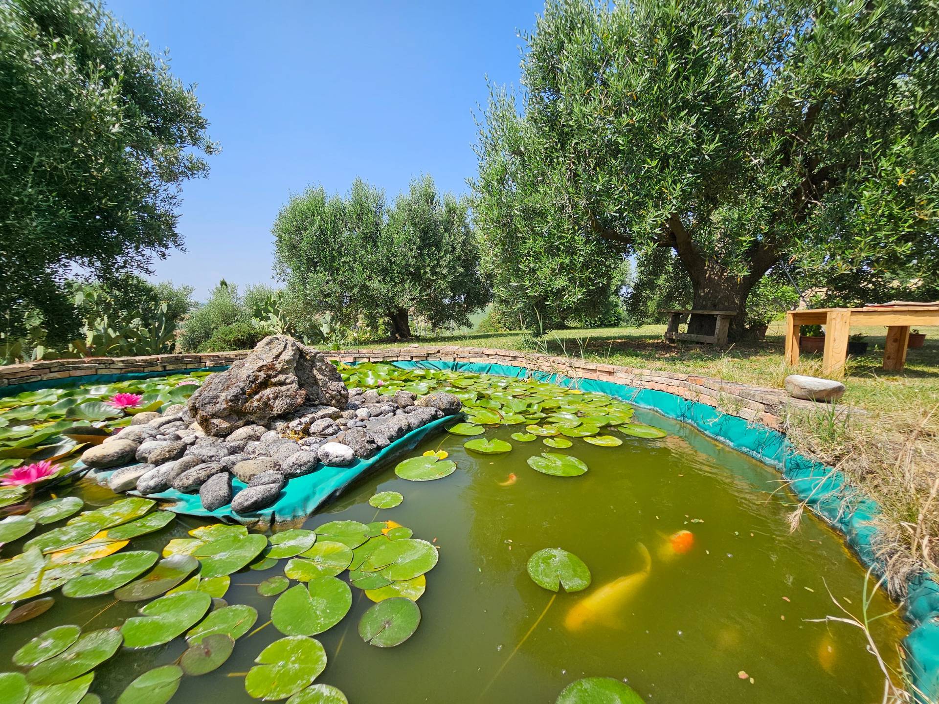 Un contesto incantevole con bellissimi squarci di vista sul panorama circostante. Davvero affascinanti sono i numerosi ulivi presenti così come le piante da frutto e la suggestiva vasca dove crescono ninfee ed abitano attualmente circa 20 carpe Koi.