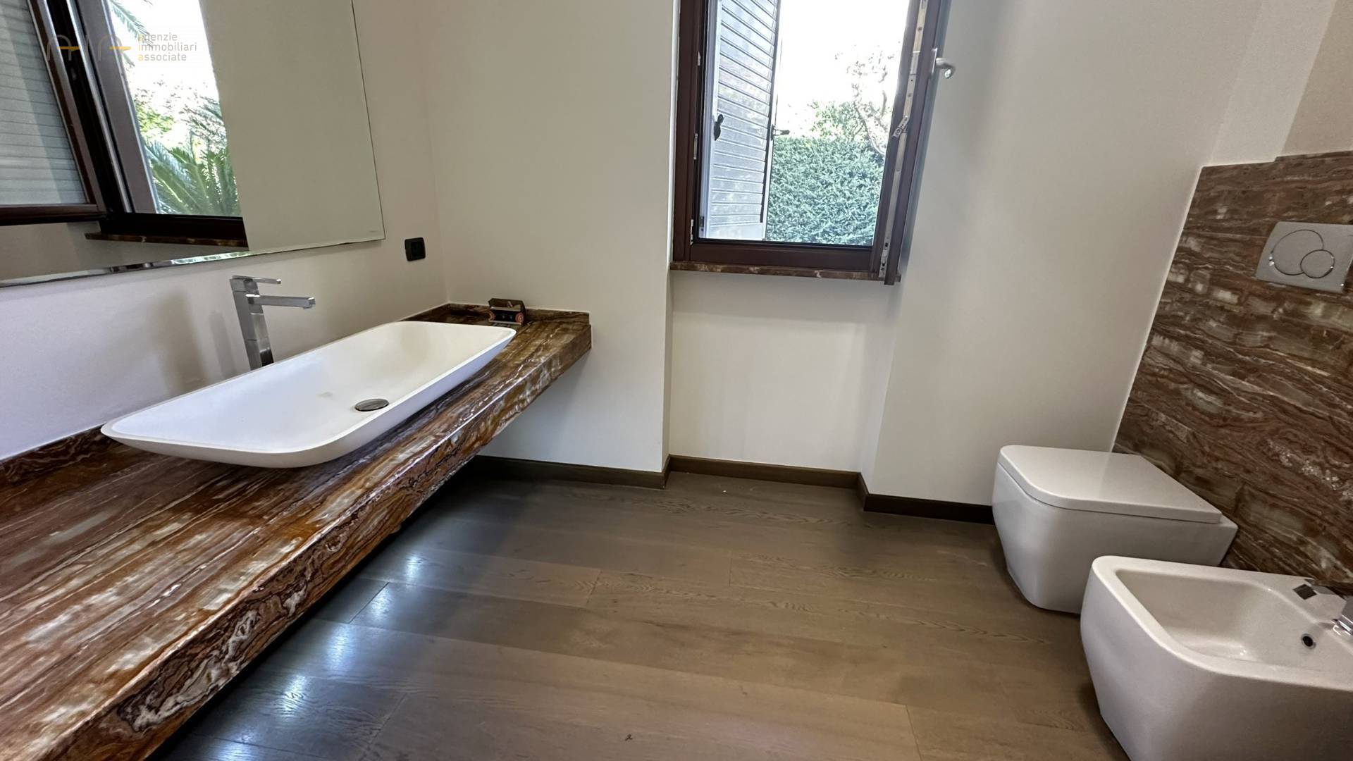 Esclusiva villa singola situata a pochi passi dal lungomare Rinascimento una vera e propria oasi di tranquillità a pochi passi dal mare. La sua posizione privilegiata, unita alla sua architettura moderna e raffinata, la rende una soluzione ideale per chi desidera vivere in un ambiente elegante e confortevole, inoltre dotata di pannelli solari e di cappotto termoacustico per garantire un elevato risparmio energetico.. La proprietà, per un totale di di 230 mq coperti, e' in perfette condizioni, con rifiniture di pregio ed è suddivisa nel seguente modo: al piano terra di circa 120 mq , troviamo un ampio e luminoso soggiorno, una cucina abitabile completamente arredata, due confortevoli camere da letto e 2 bagni tutti dotati di finiture di alta qualità , con una comoda scala interna si accede al piano superiore di circa 40 mq con 2 vani e bagno oltre a 2 bellissime terrazze coperte di circa 90 mq. Dispone inoltre di ampio locale taverna di 70 mq con camino e bagno ed un comodo garage doppio di 42 mq ideale per 2 auto. L'esterno della villa è altrettanto suggestivo, con una corte di circa 340 mq e un giardino perimetrale curato nei minimi dettagli, perfetto per godersi il clima mite della zona, l'intera proprietà è completamente recintata e dispone di un altro ingresso carrabile con cancello che consente di parcheggiare anche auto ed altri mezzi.