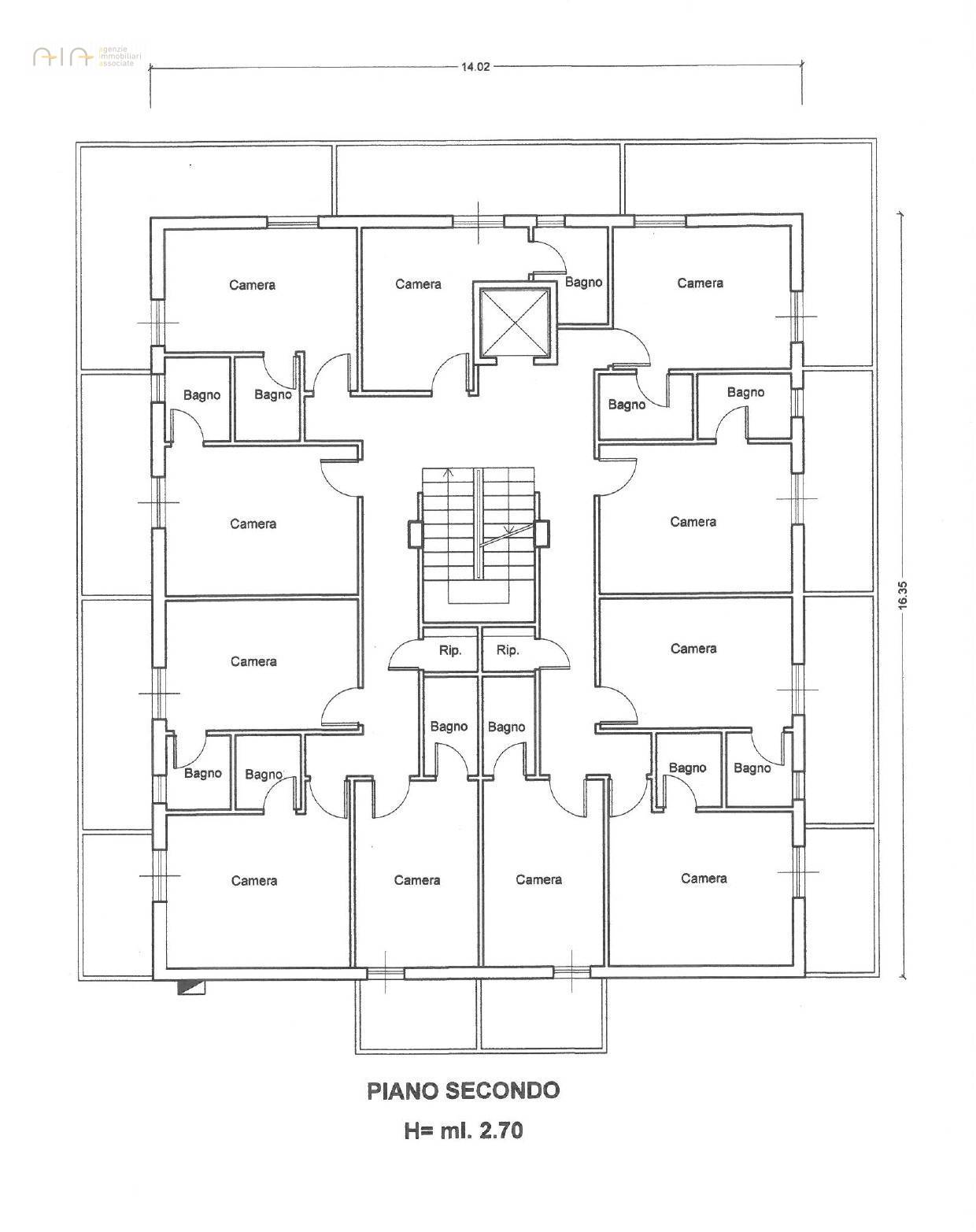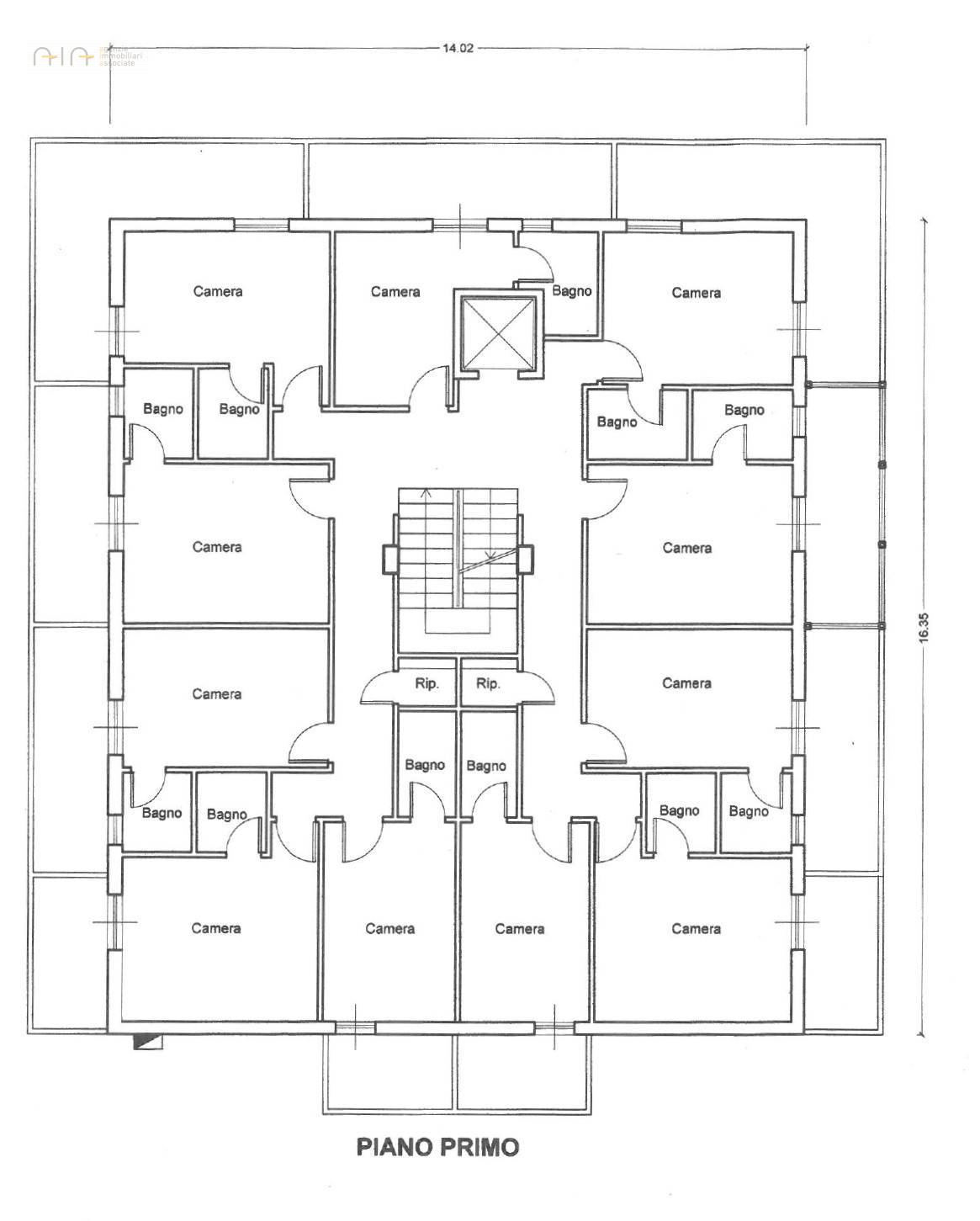 - ai piani primo e secondo di complessivi mq 456 circa sono distribuite n. 22 camere di media grandezza, ciascuna con bagno privato, e su ciascun piano, a servizio delle camere stesse, un balcone perimetrale continuo su tre lati ed uno staccato sul quarto lato, di complessivi mq 85 circa per ciascun piano;