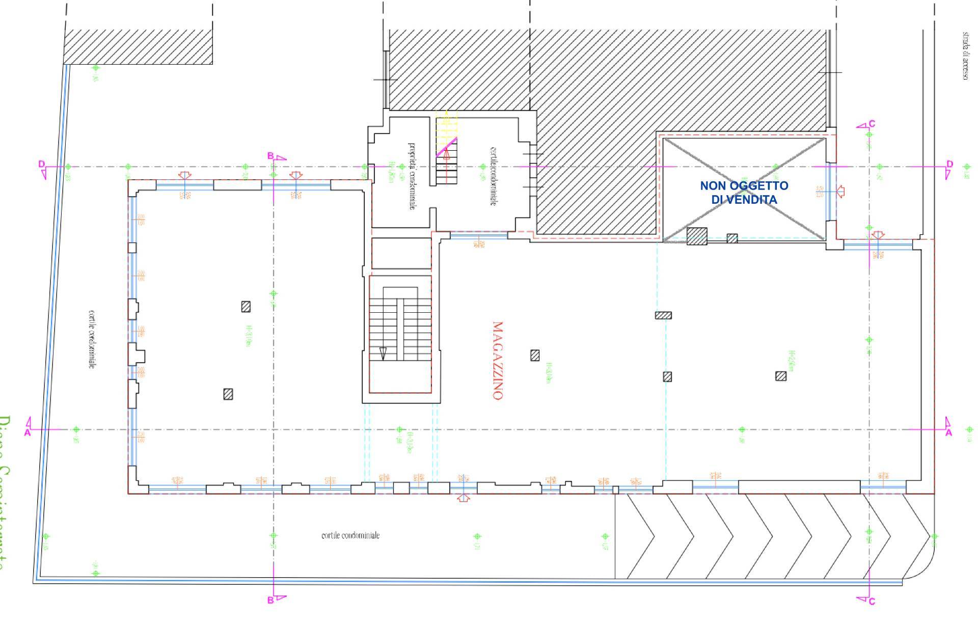Locale al Piano Terra a destinazione magazzino, delle dimensioni di 400 mq. circa, composto da un unico ampio vano fornito anche di doppio scivolo per accesso anche carrabile (sia all'interno sia dall'esterno).