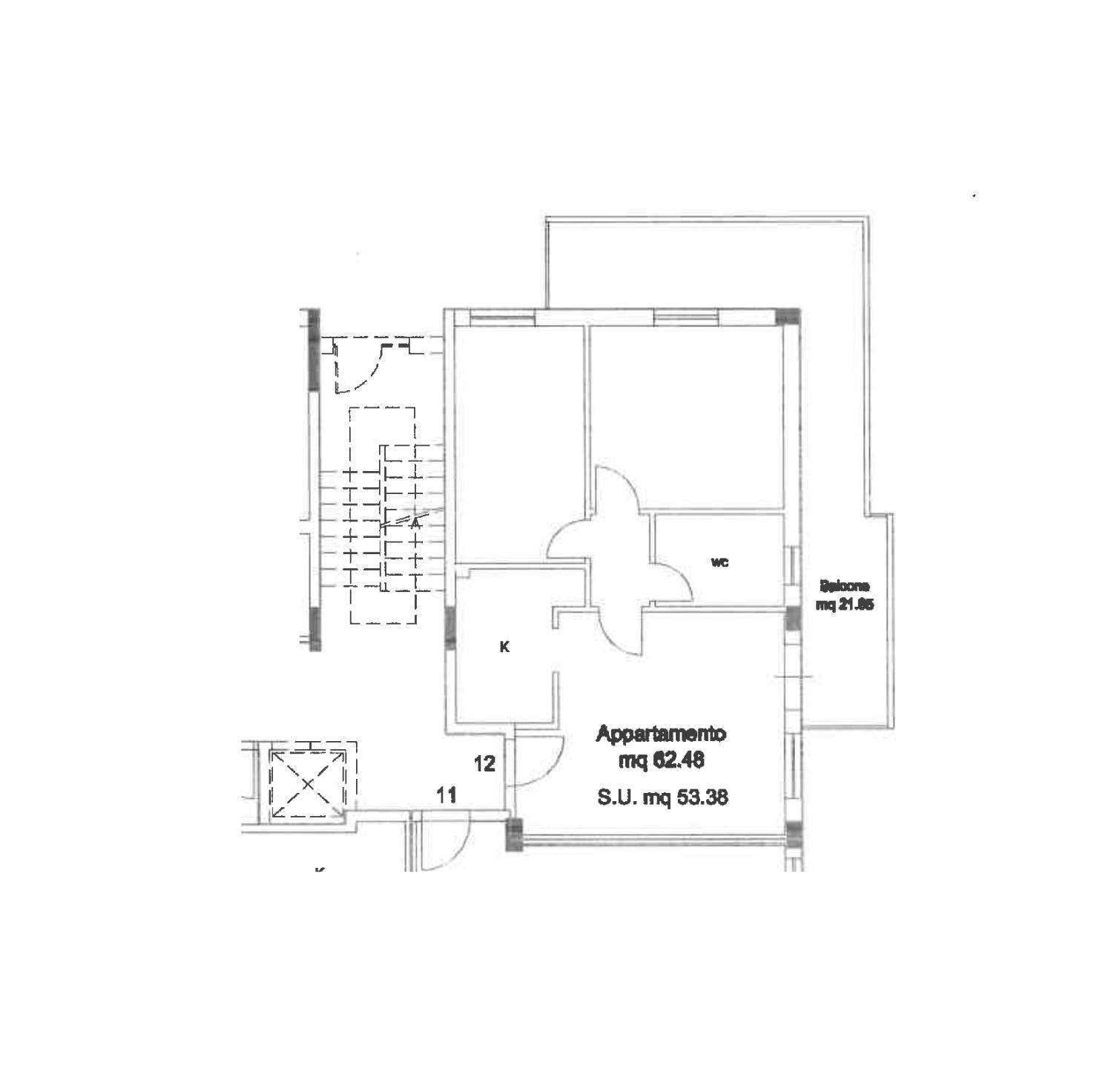 L'immobile è composto da ingresso su soggiorno, cucina con angolo cottura separato, due camere da letto (una matrimoniale e una doppia), un bagno finestrato con box doccia e un disimpegno nella zona notte. Completano la proprietà uno splendido balcone abitabile di circa 22 m², ideale per pranzi e cene all'aperto durante la bella stagione.