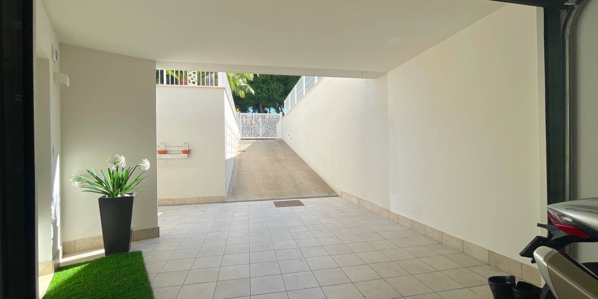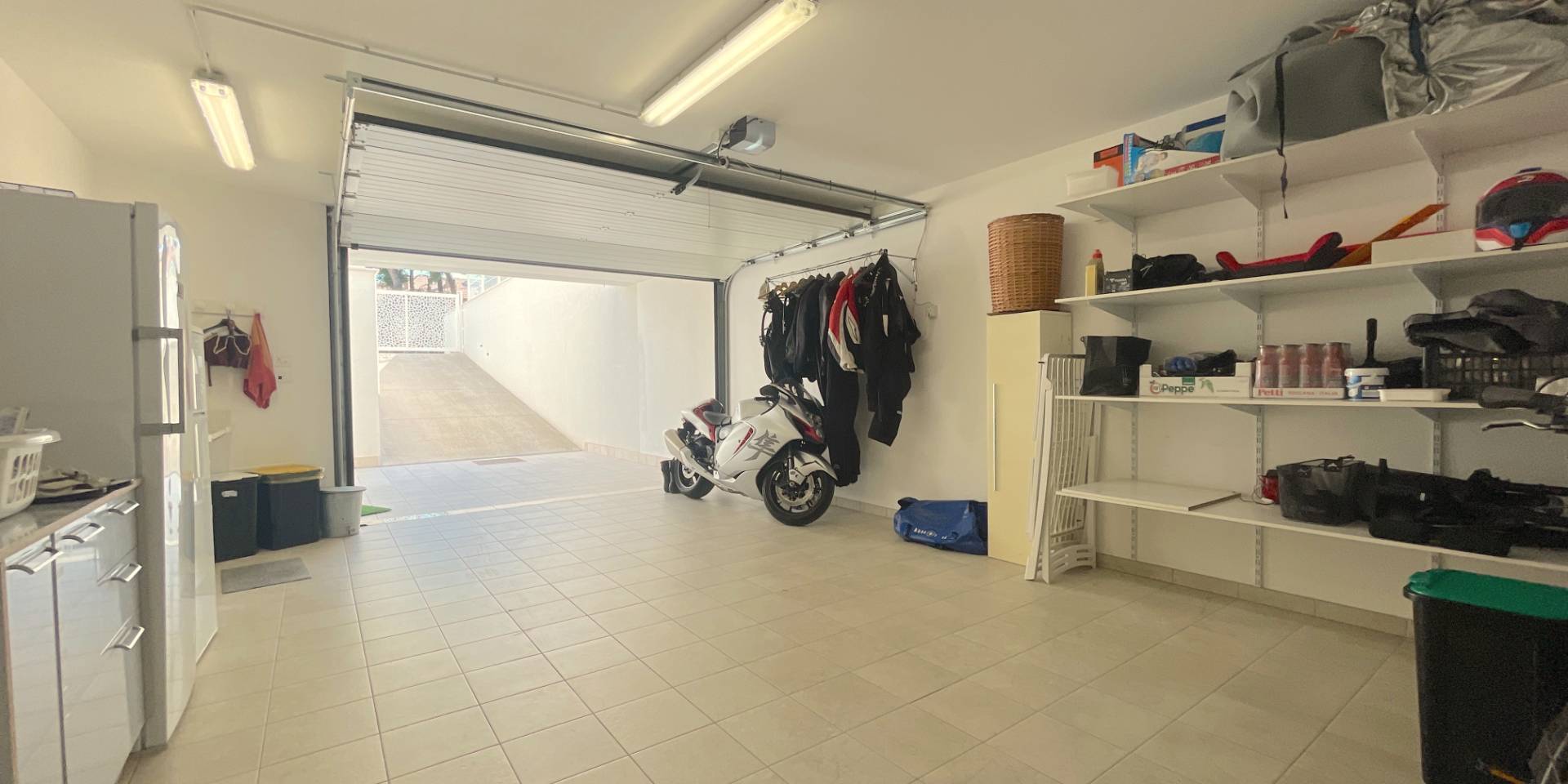 La proprietà si sviluppa su quattro livelli, collegati anche da un comodo ascensore interno. Al piano seminterrato, di circa 185 m², si apre una luminosa e accogliente taverna con cucina, affiancata da tre ampie stanze, due bagni finestrati, un garage capace di ospitare due autovetture e un corridoio con scala di accesso ai piani superiori. Il piano terra, di circa 70 m², è dedicato alla zona giorno, con un ingresso che conduce a un salotto spazioso e luminoso, una cucina abitabile con dispensa e un bagno di servizio. All'esterno si trovano due porticati di oltre 30 m² e un magnifico giardino di circa 433 m², in parte allestito a verde con prato all'inglese e palme ad alto fusto, in parte pavimentato e organizzato come parcheggio privato per quattro autovetture.