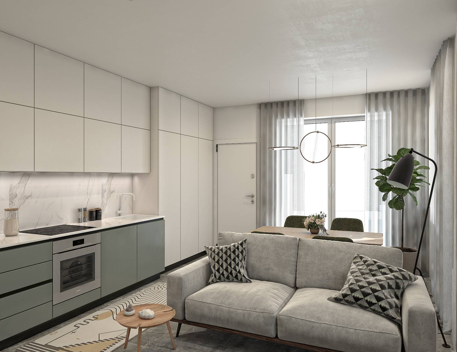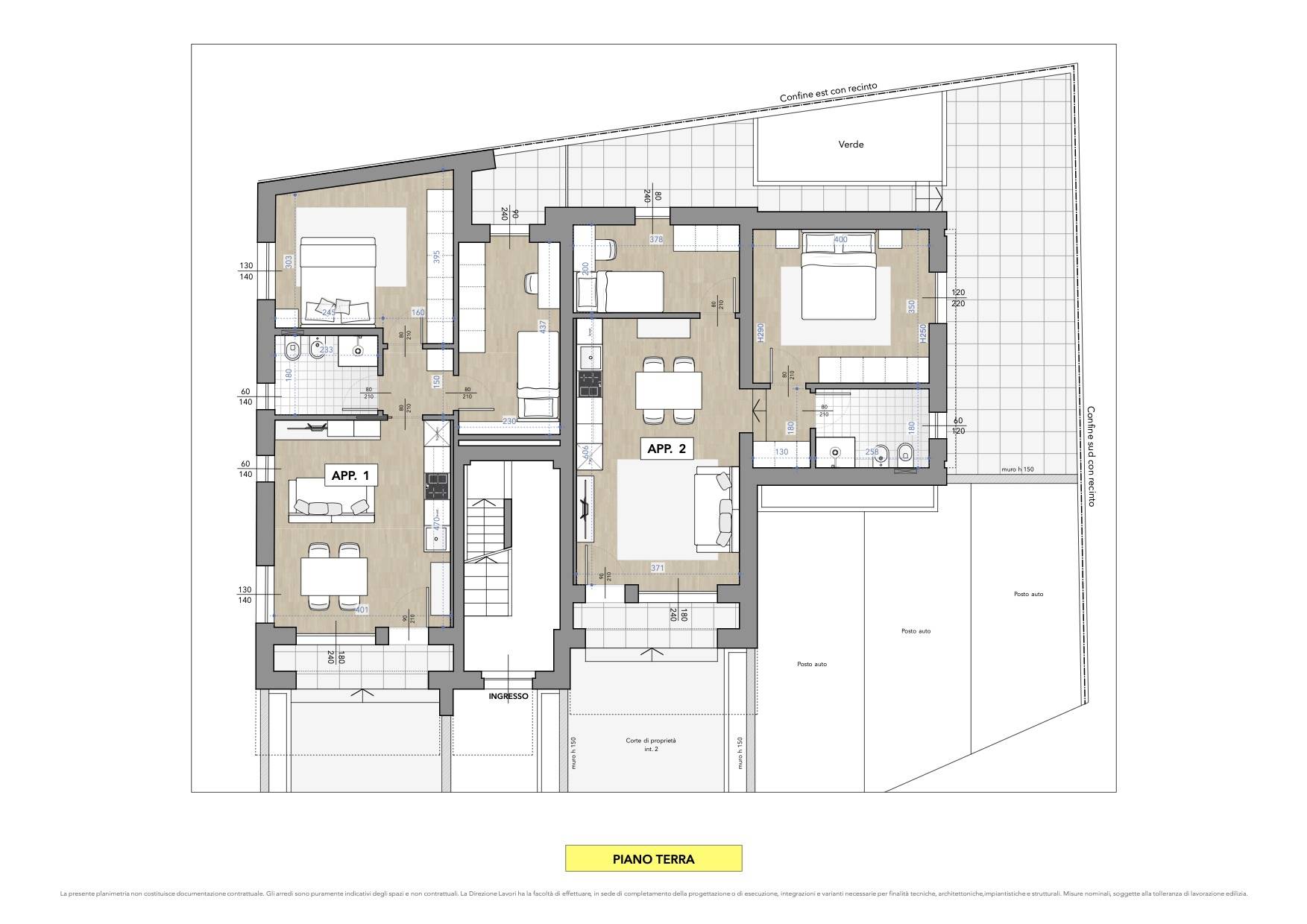 Appartamento di nuova costruzione, sito al PIANO TERRA, delle dimensioni di 64 mq. circa, composto da soggiorno con angolo cottura, 2 camere da letto (matrimoniale e singola) e bagno.