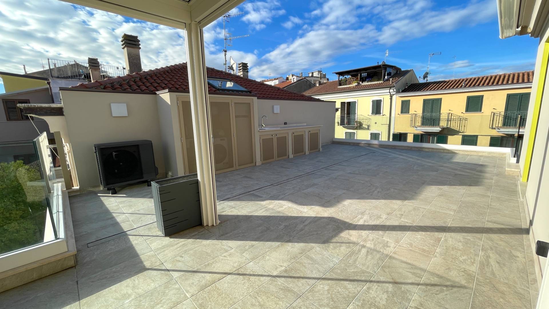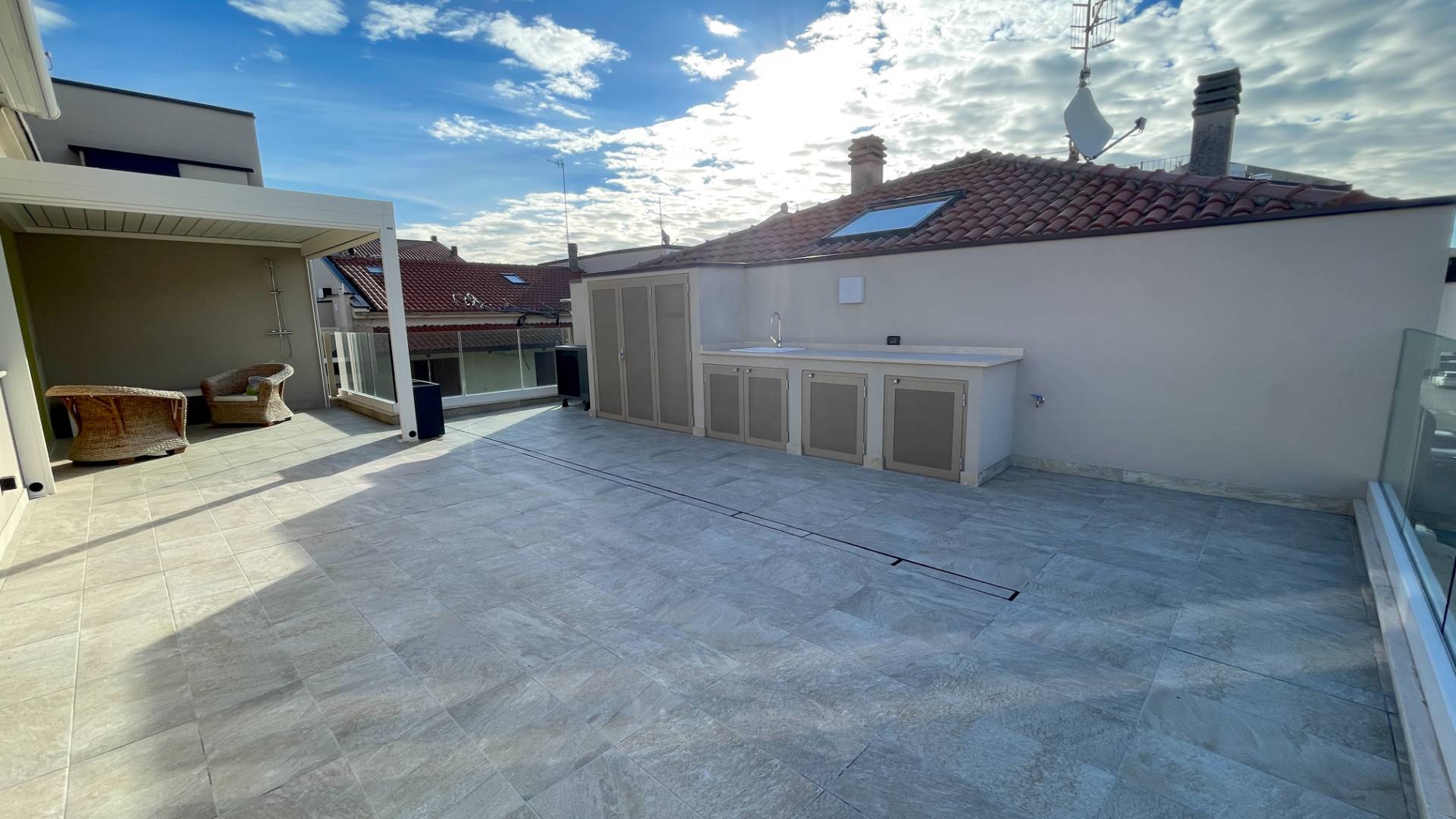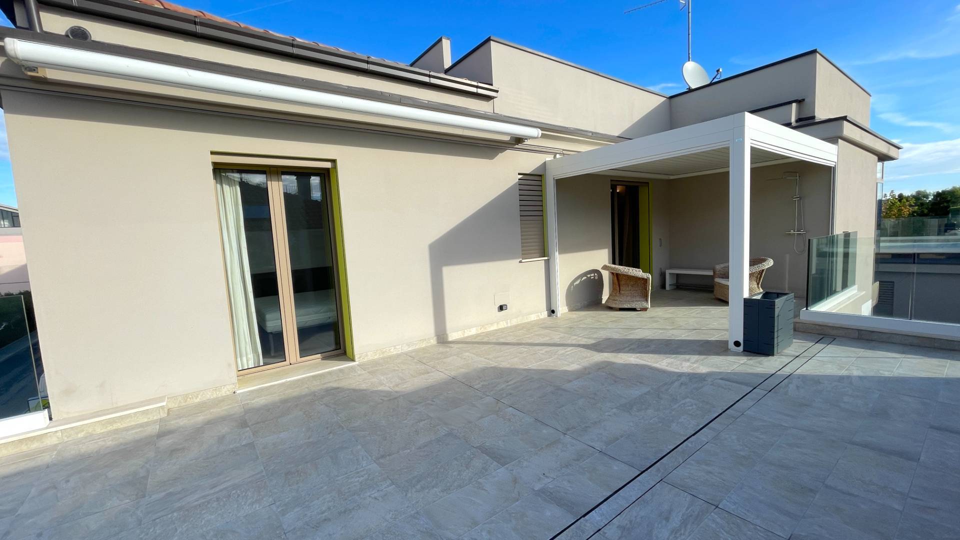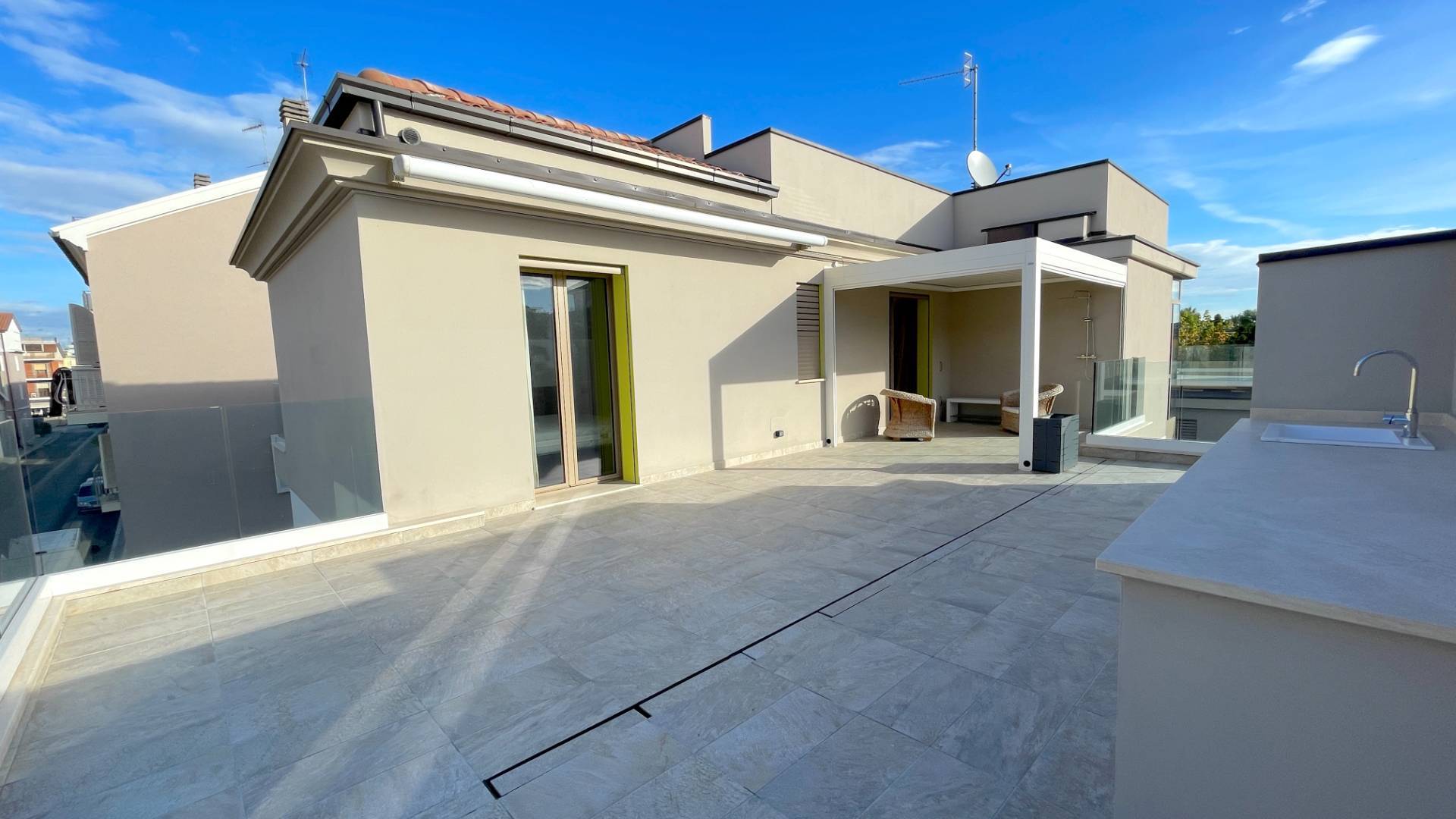 ATTICO di nuova costruzione delle dimensioni di 75 mq. circa, composto da soggiorno con cucina a vista, 2 camere da letto matrimioniali, 2 bagni (entrambi con doccia e finestra) ed ampia terrazza a livello di 70 mq. circa allestita con pergotenda, tenda ombreggainte elettrica, angolo lavanderia e cucina esterna.