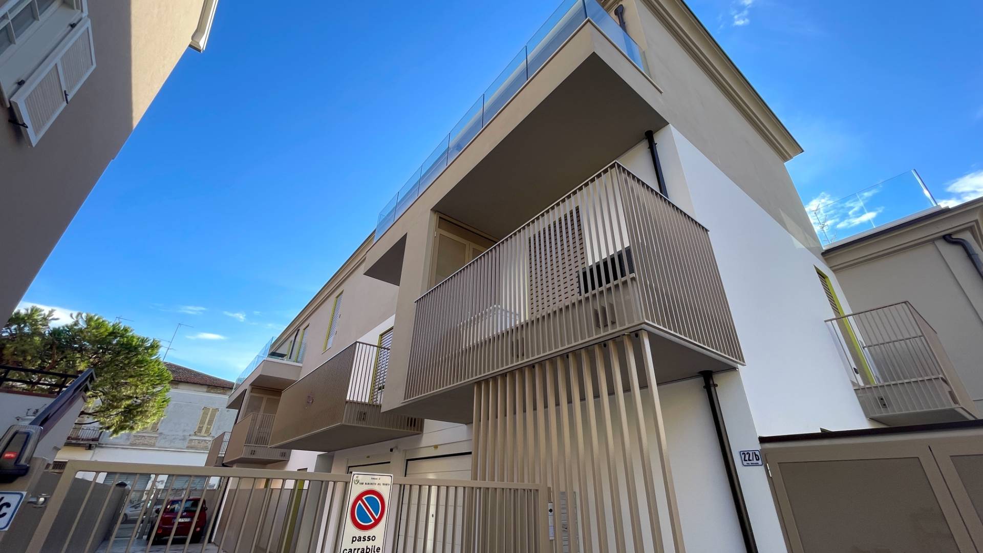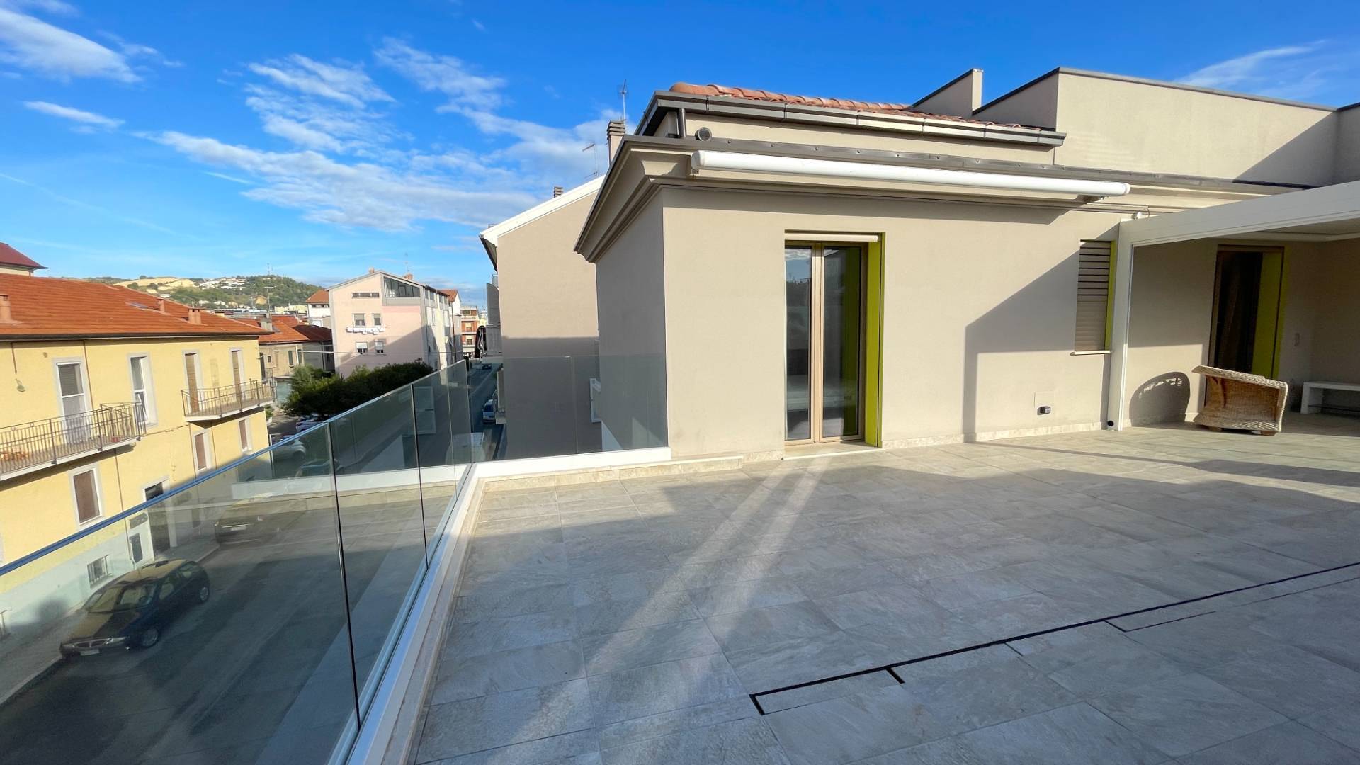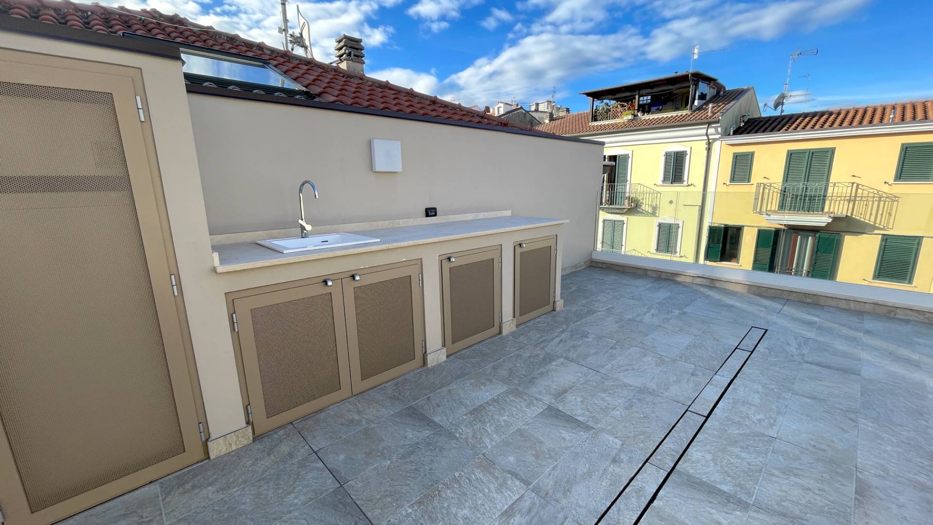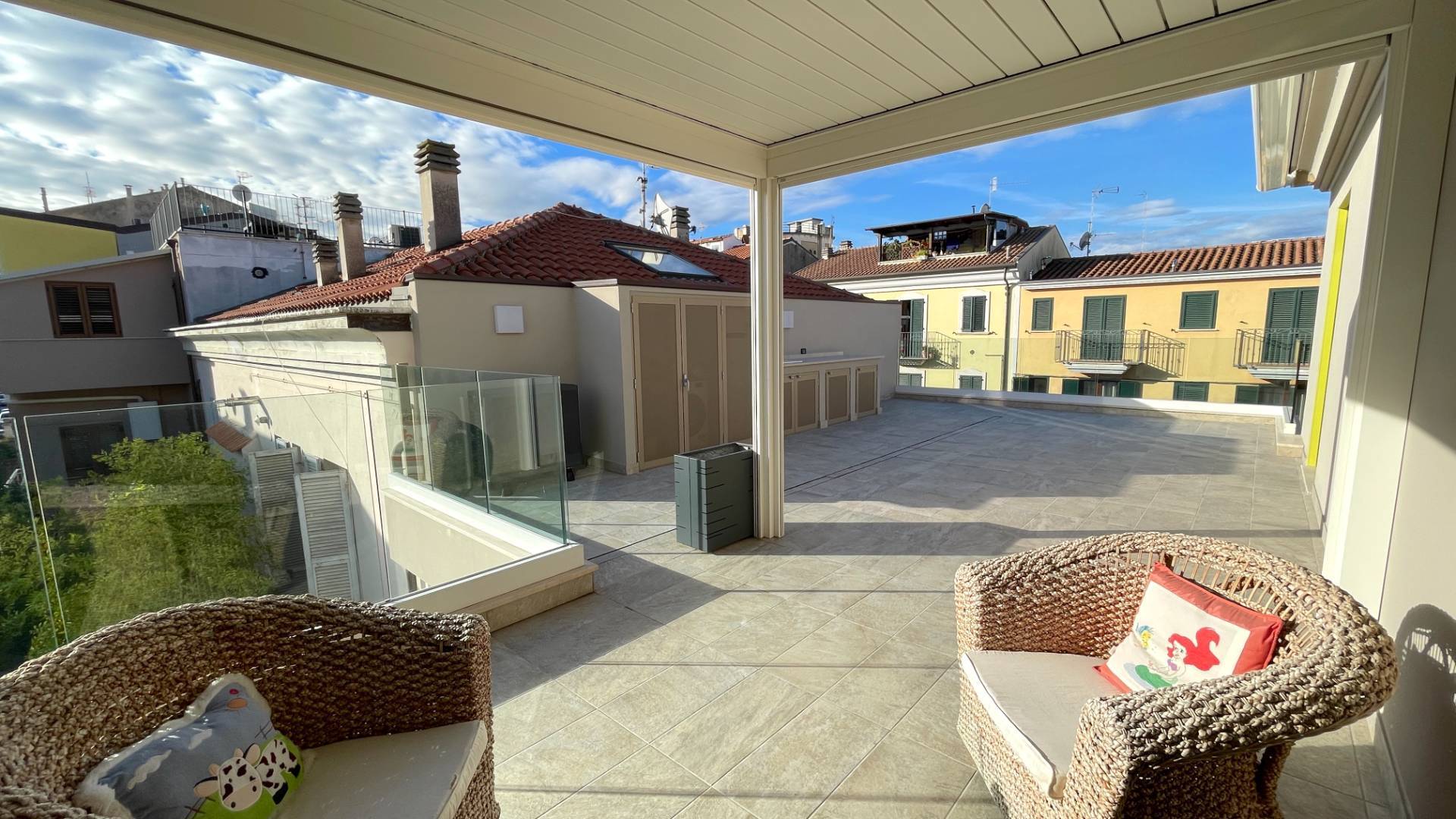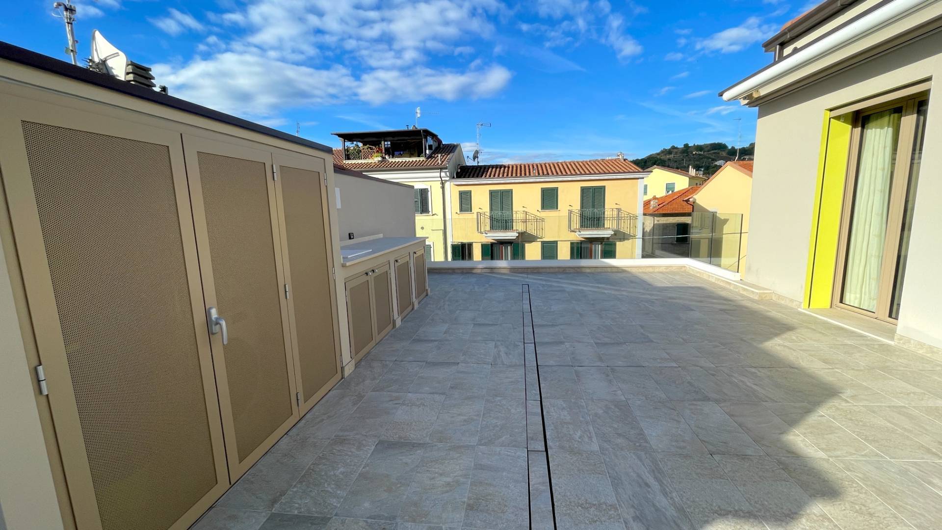 ATTICO di nuova costruzione delle dimensioni di 75 mq. circa, composto da soggiorno con cucina a vista, 2 camere da letto matrimioniali, 2 bagni (entrambi con doccia e finestra) ed ampia terrazza a livello di 70 mq. circa allestita con pergotenda, tenda ombreggainte elettrica, angolo lavanderia e cucina esterna.