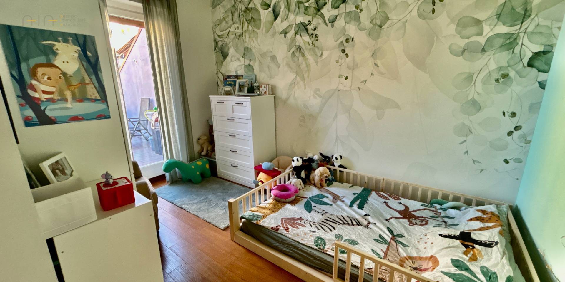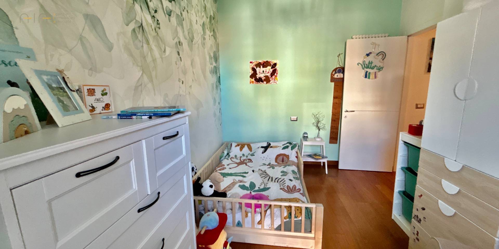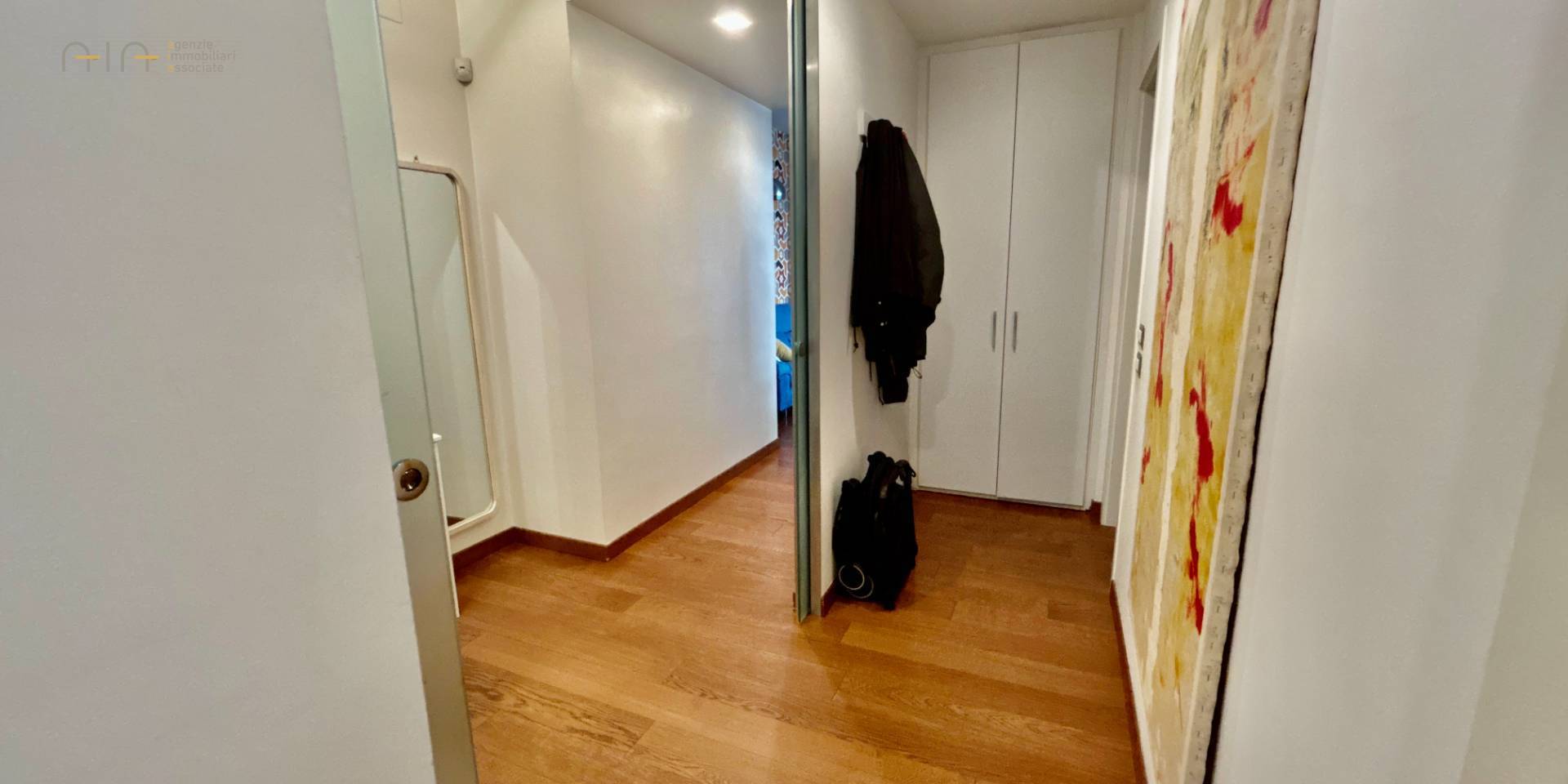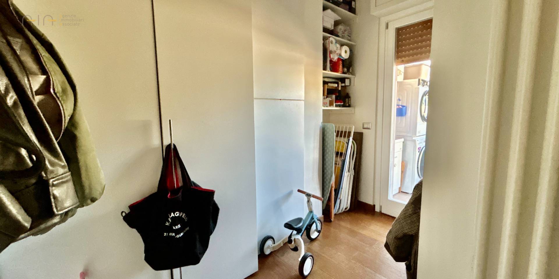 Gli spazi interni, luminosi e armoniosamente distribuiti, comprendono un ampio soggiorno con zona cucina, tre camere da letto (di cui due matrimoniali), due bagni, un ripostiglio e un balcone coperto adibito a lavanderia.