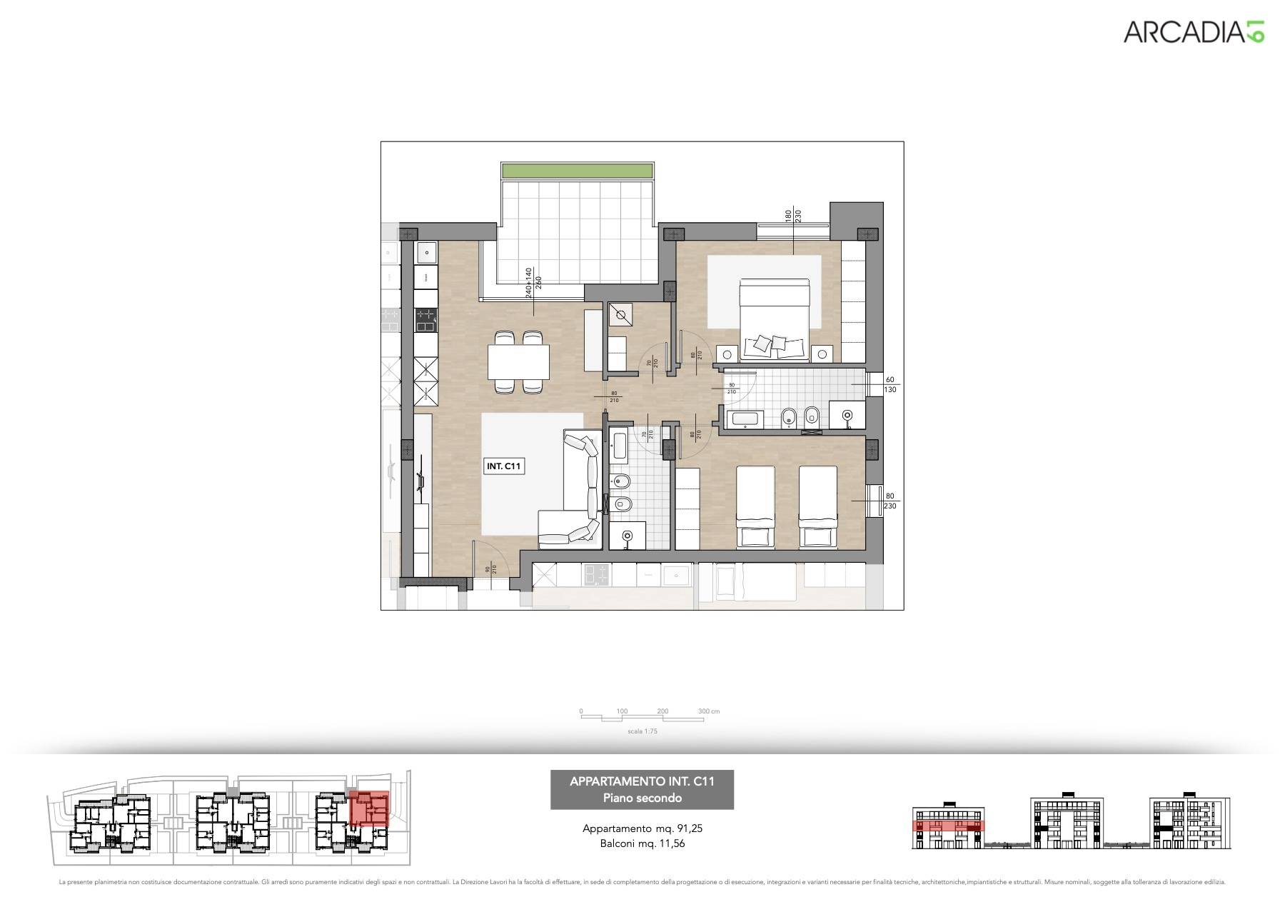 Appartamento al piano secondo con ascensore, delle dimensioni di 91 m² circa, composto da ingresso su soggiorno con angolo cottura, due camere da letto (una matrimoniale ed una doppia), due bagni di cui uno finestrato, locale lavanderia, corridoio nel reparto notte. L'Appartamento è inoltre fornito di una terrazza abitabile di ben 11 mq circa, fruibile nella bella stagione per poterci soggiornare.