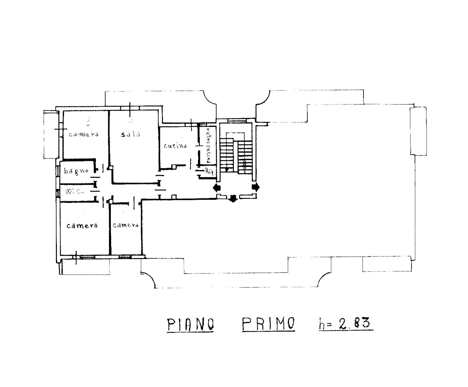 Appartamento al Piano Primo delle dimensioni di 130 mq. circa, composto da ampio ingresso, soggiorno, cucina abitabile con retro, ripostiglio, 3 camere da letto (2 matrimoniali + 1 singola), 2 bagni e ampi balconi per complessivi 25 mq. circa.