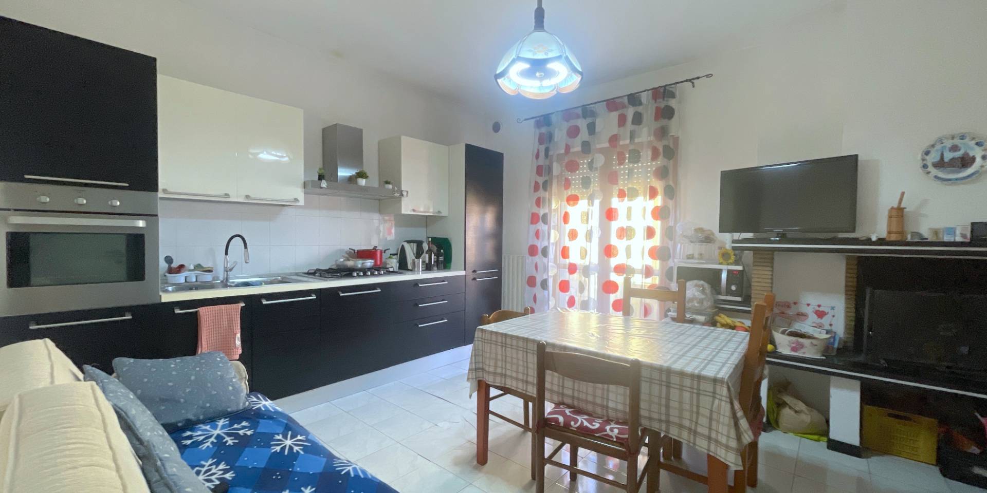 La casa si apre su un comodo disimpegno e prosegue con un soggiorno ampio, una grande cucina abitabile con camino e retro-cucina, tre camere (due matrimoniali e una singola generosa), due bagni - uno dei quali con finestra - e un corridoio dedicato alla zona notte.