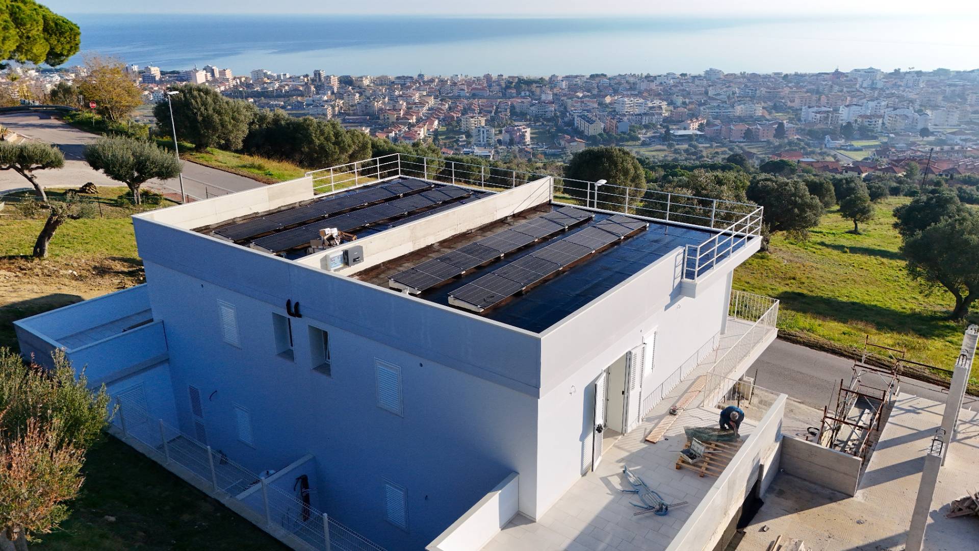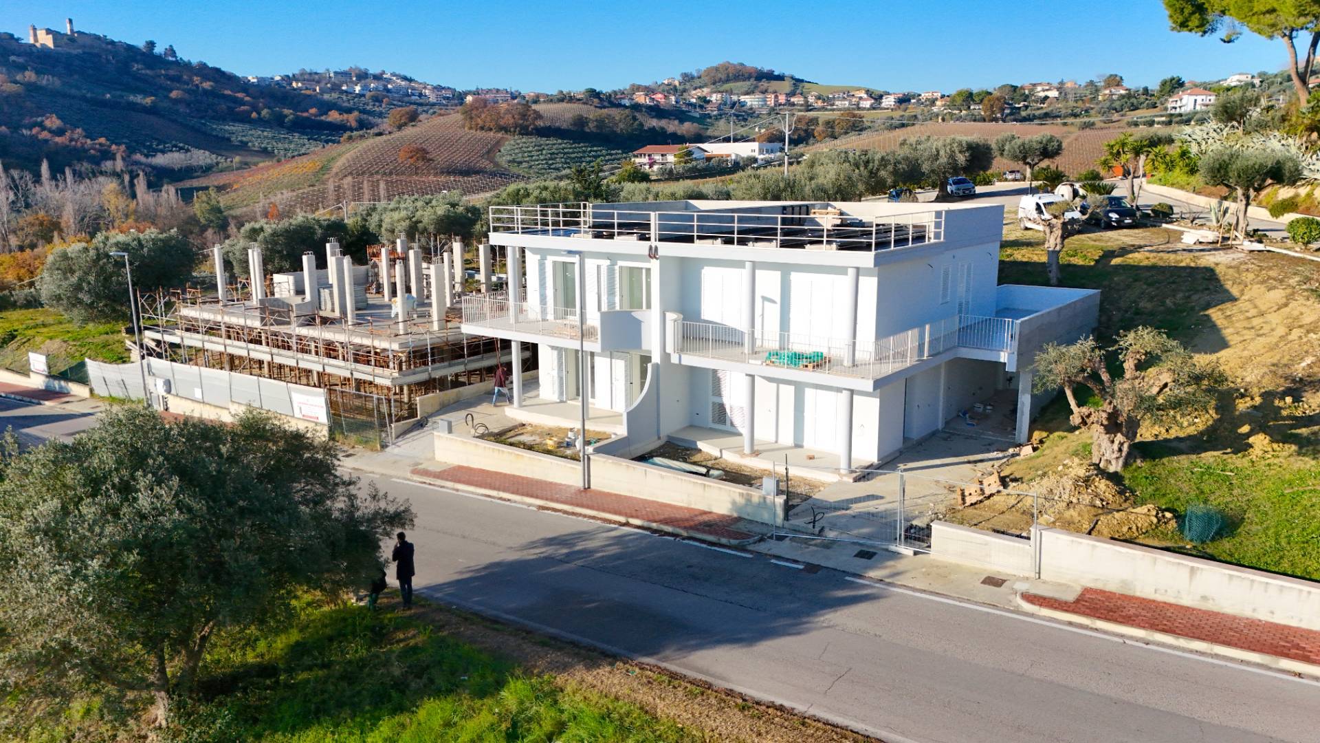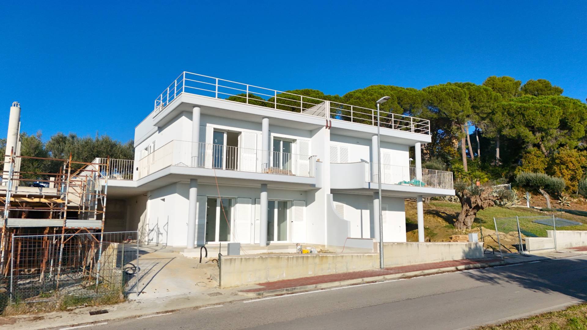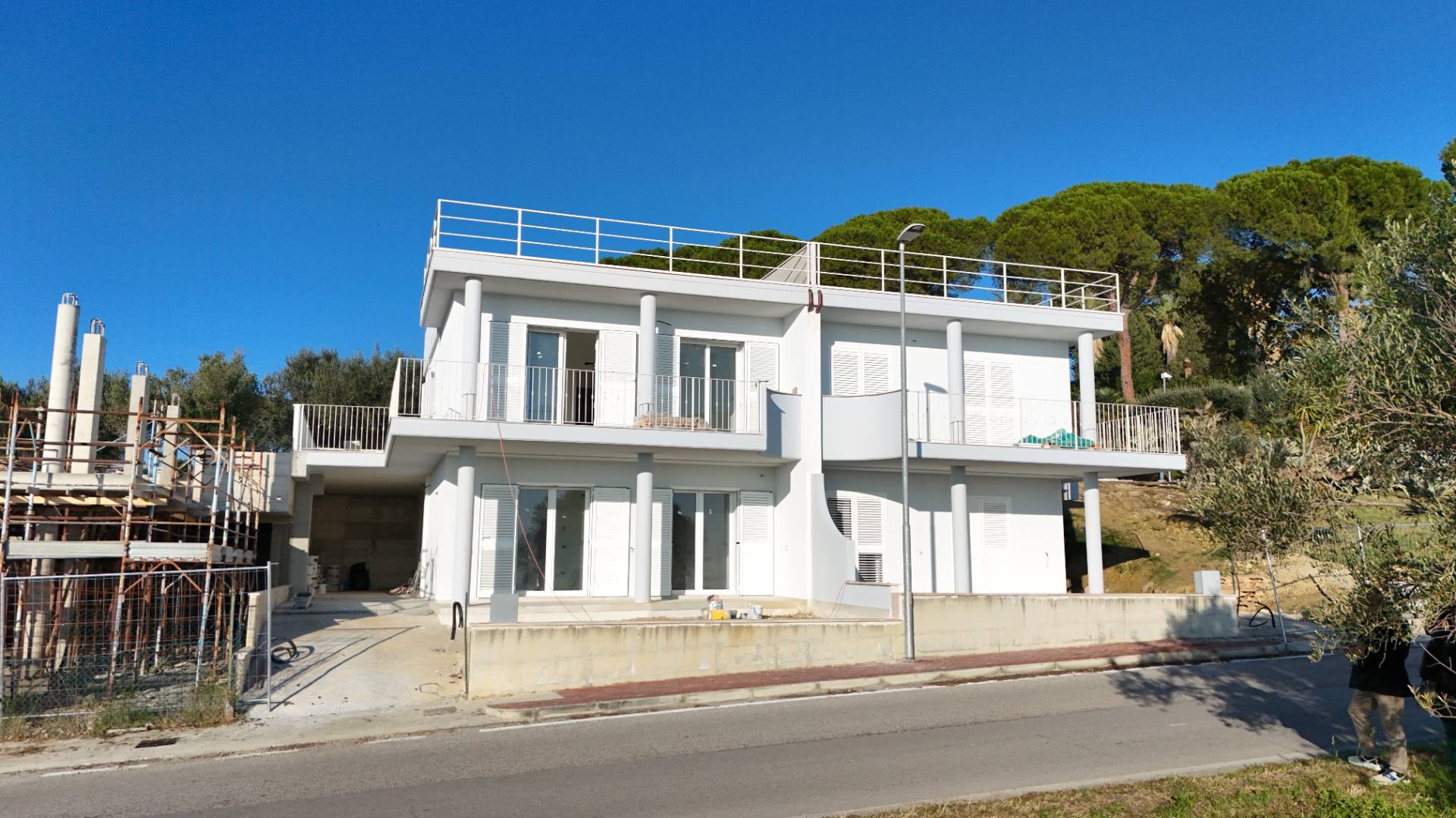 Villino bifamiliare in corso di costruzione, dallo stile contemporaneo e pulito, sviluppato su due livelli per una superficie coperta complessiva di circa 135 m². Una soluzione moderna, pensata per chi cerca comfort, efficienza e spazi ben distribuiti, senza rinunciare alla vista mare.