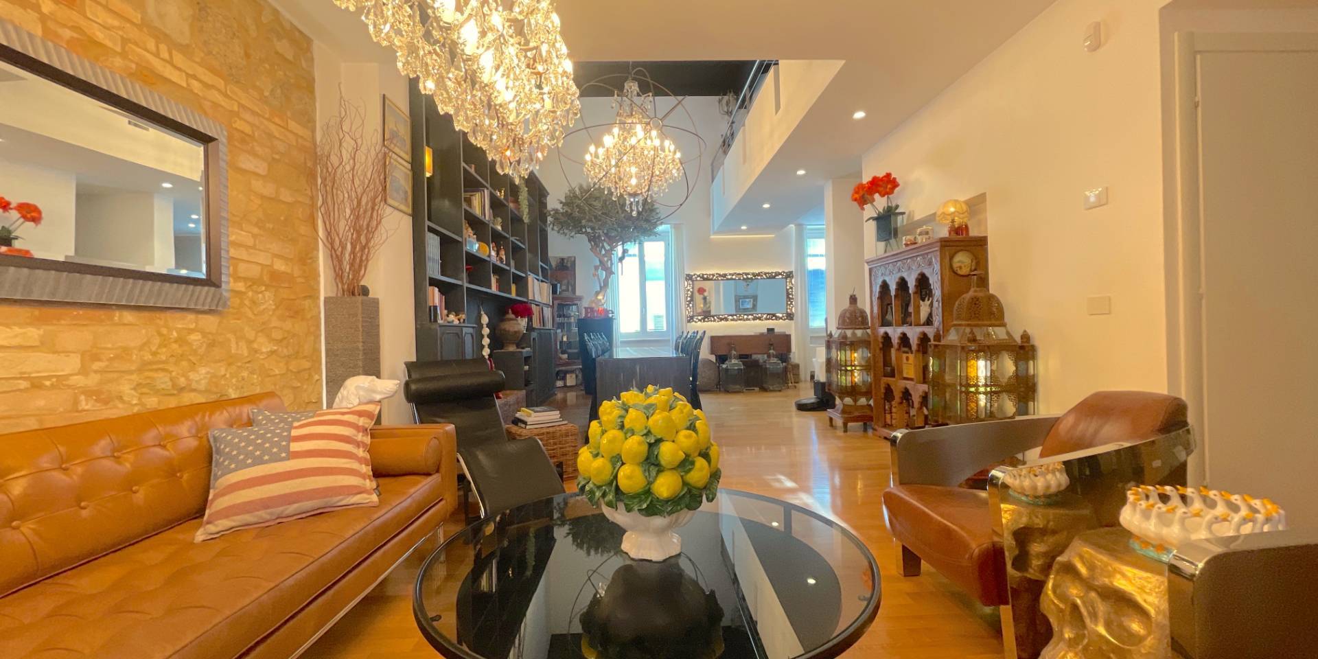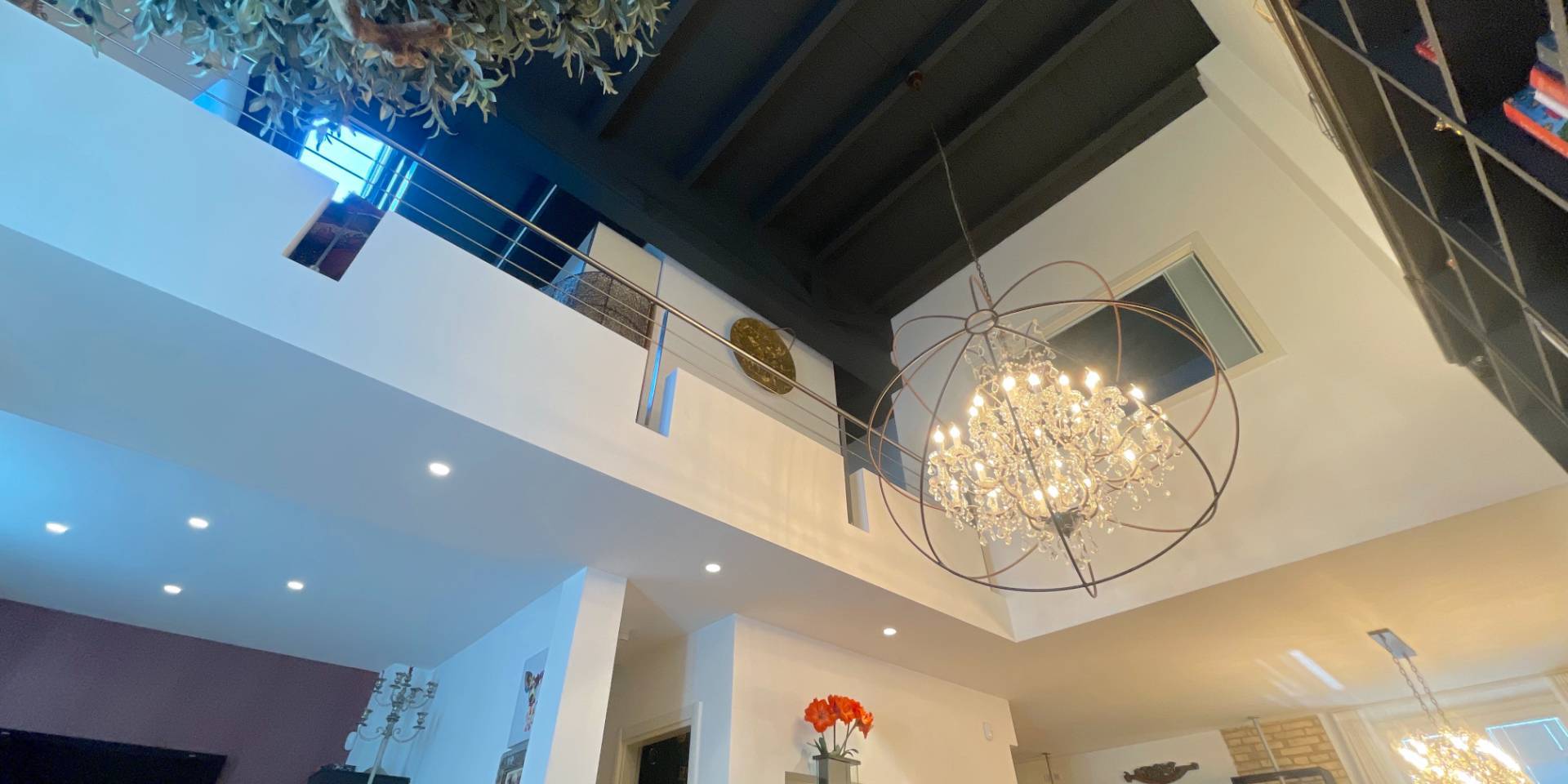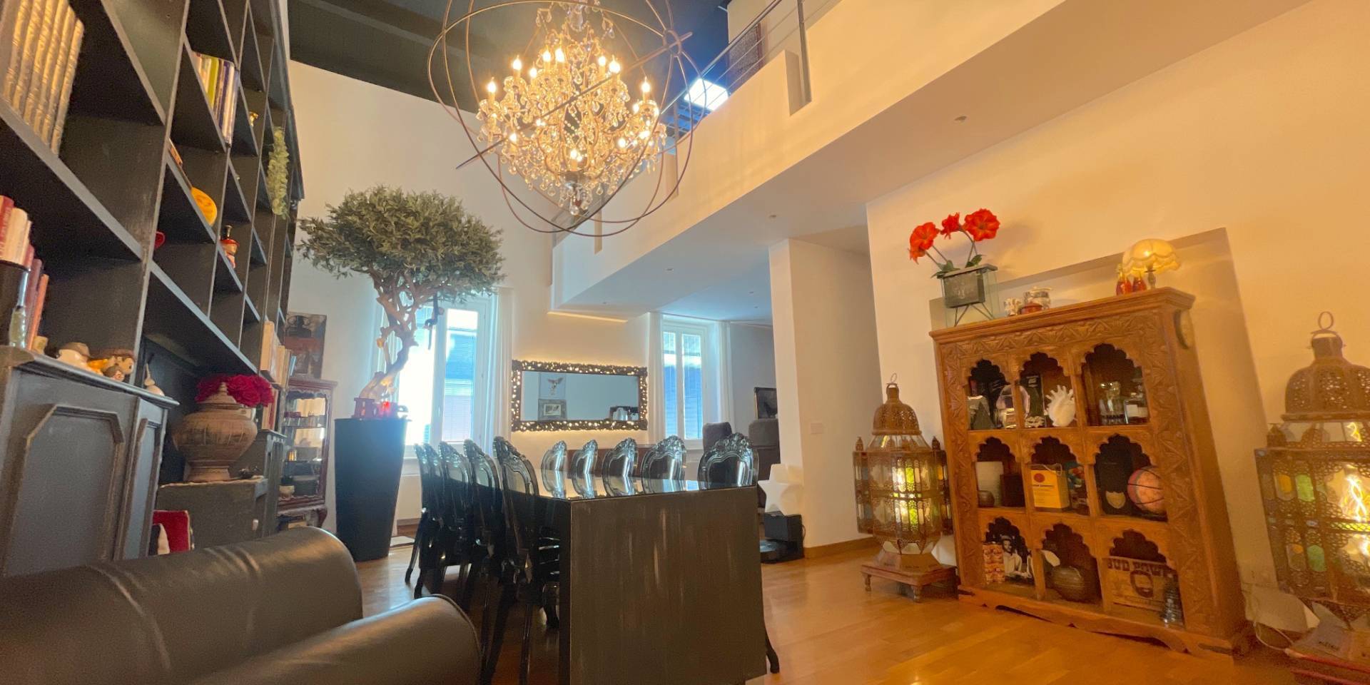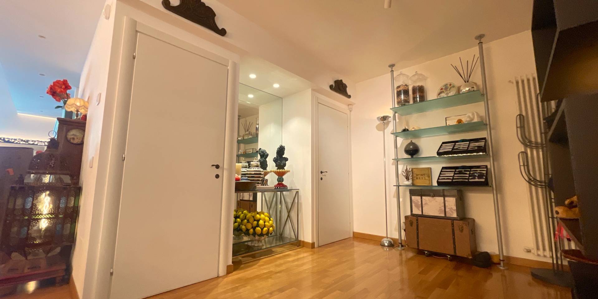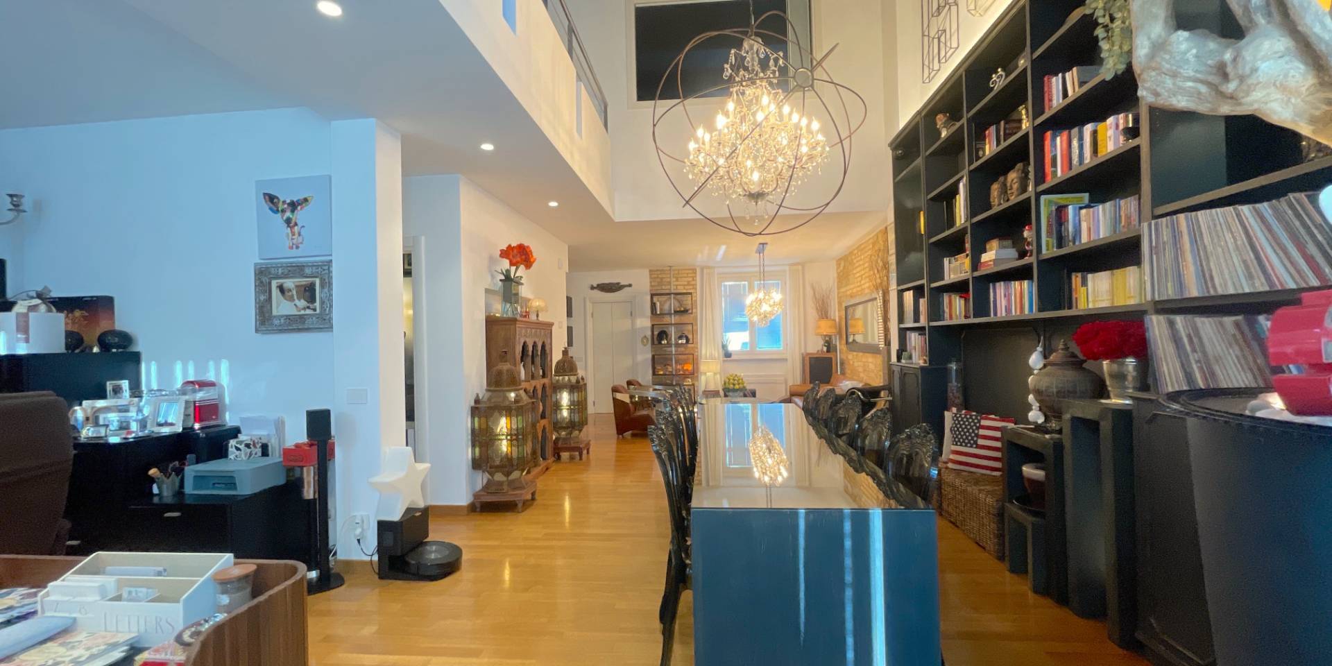 L'ingresso si apre al secondo piano di circa 100 mq, con un ampio disimpegno che accompagna in un grande salone davvero scenografico: qui l'altezza interna arriva a circa 8 metri, un volume importante, raro, che dà carattere e personalità all'intera casa.