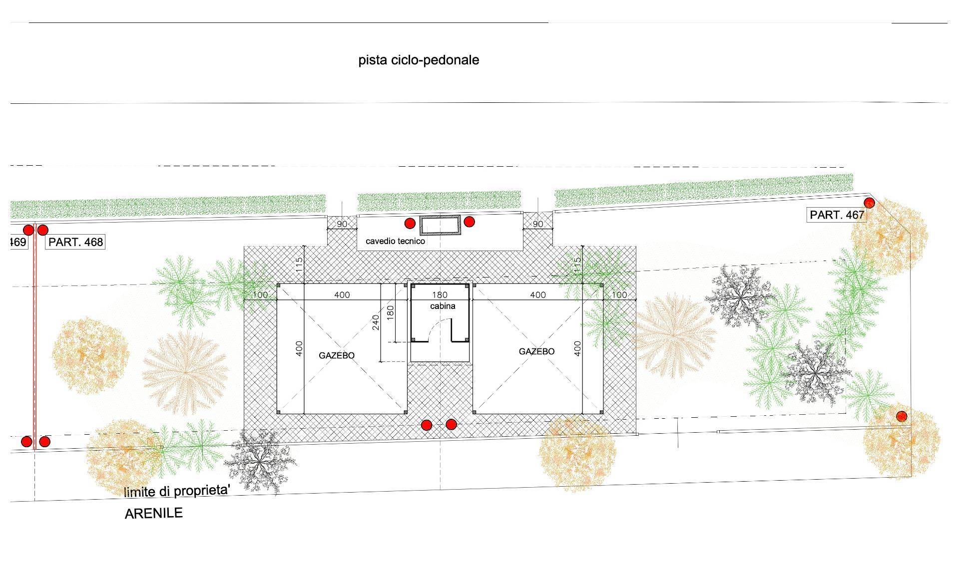 Sull'appezzamento di terreno in oggetto è possibile realizzare una cabina delle dimensioni di 1,80 x 1,80 metri oltre due gazebo ciascuno di 16 mq: totale superficie coperta sul lotto: 35,24 metri.
