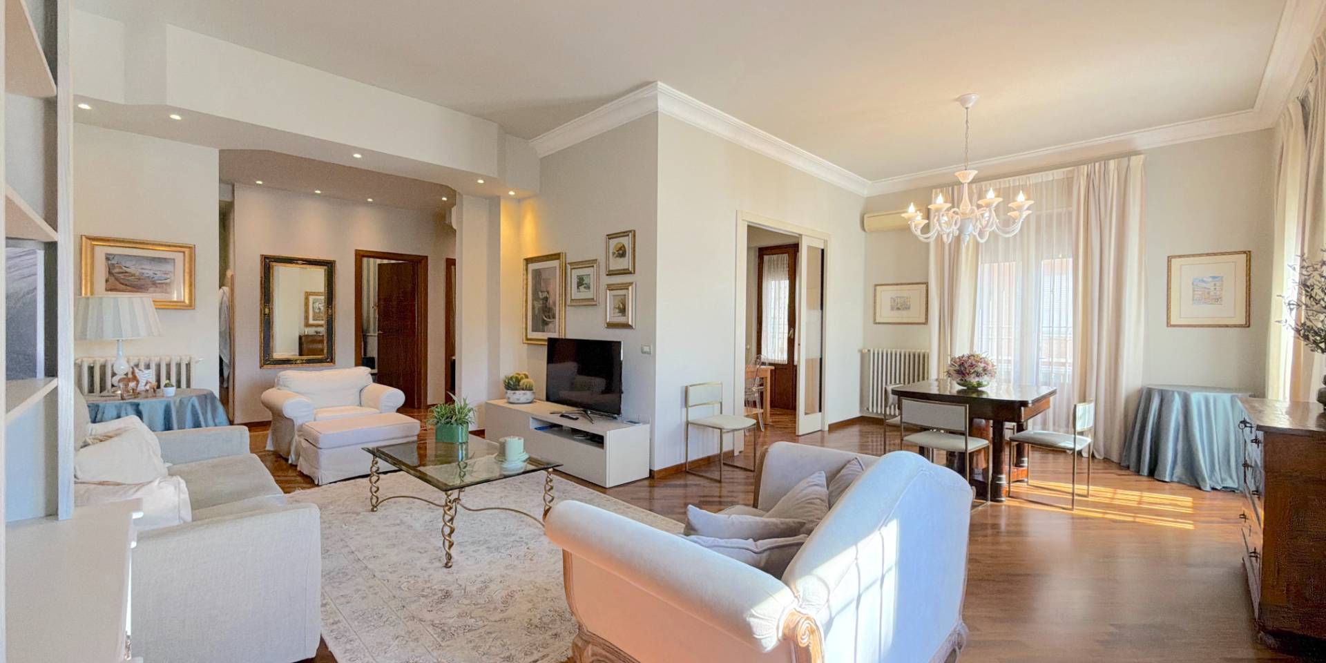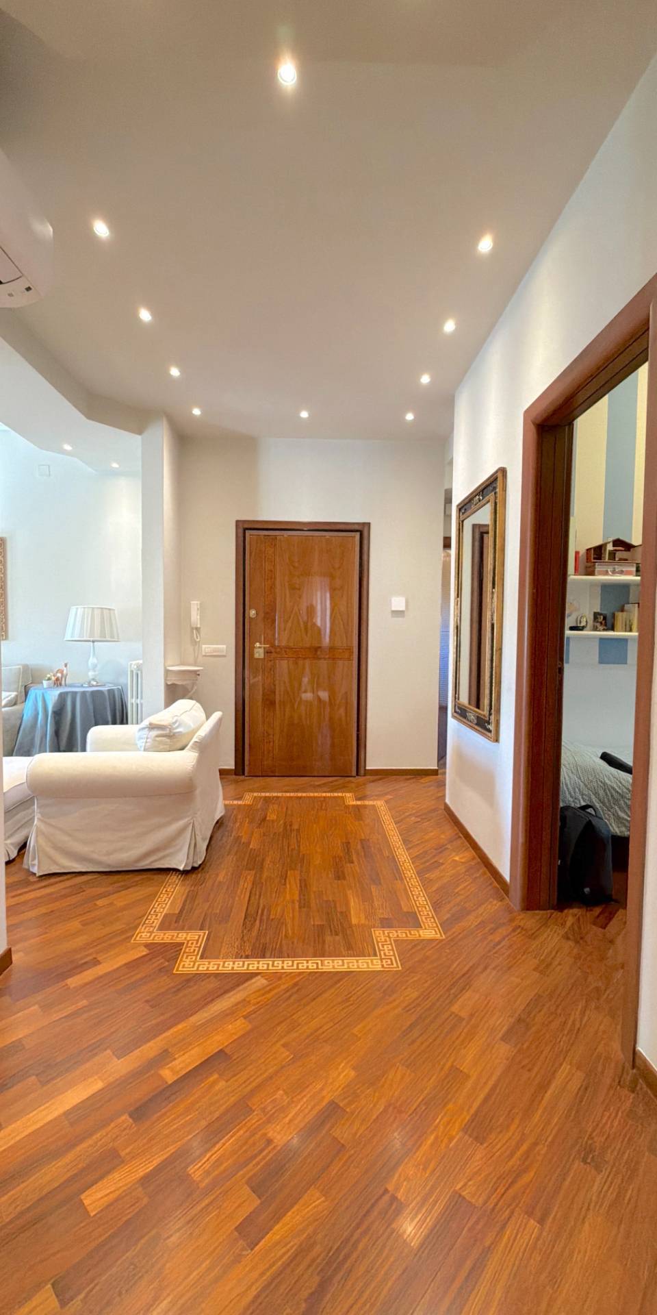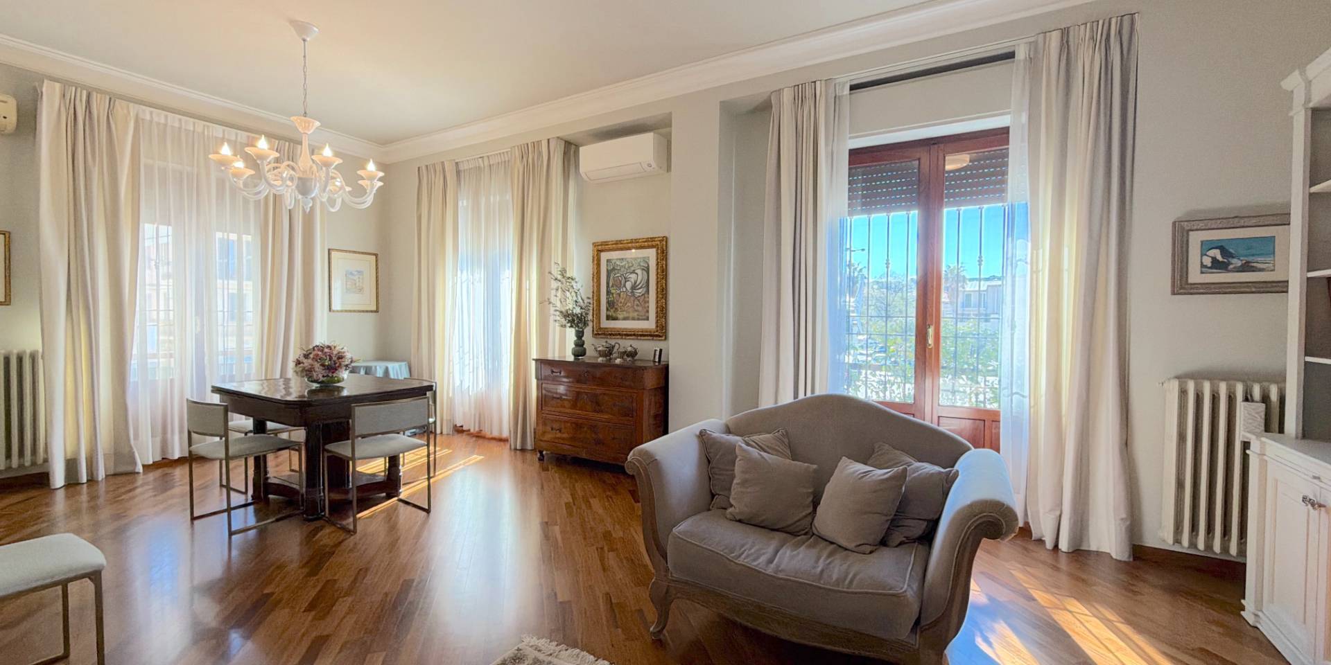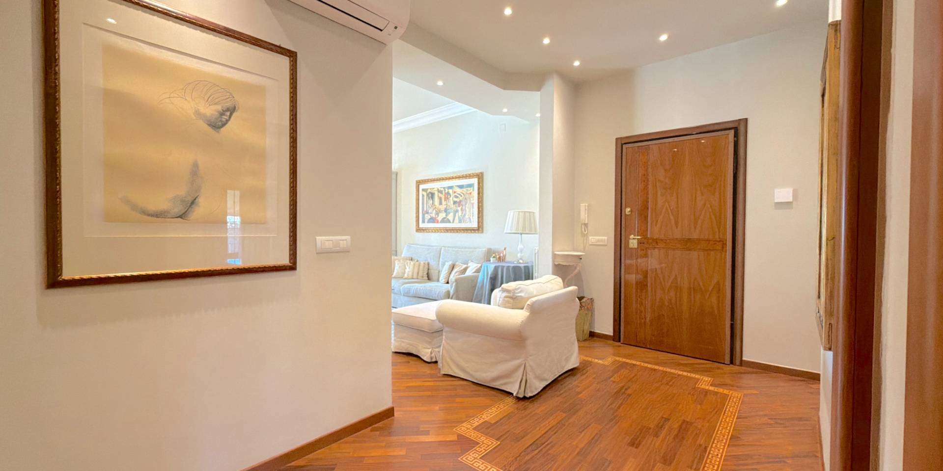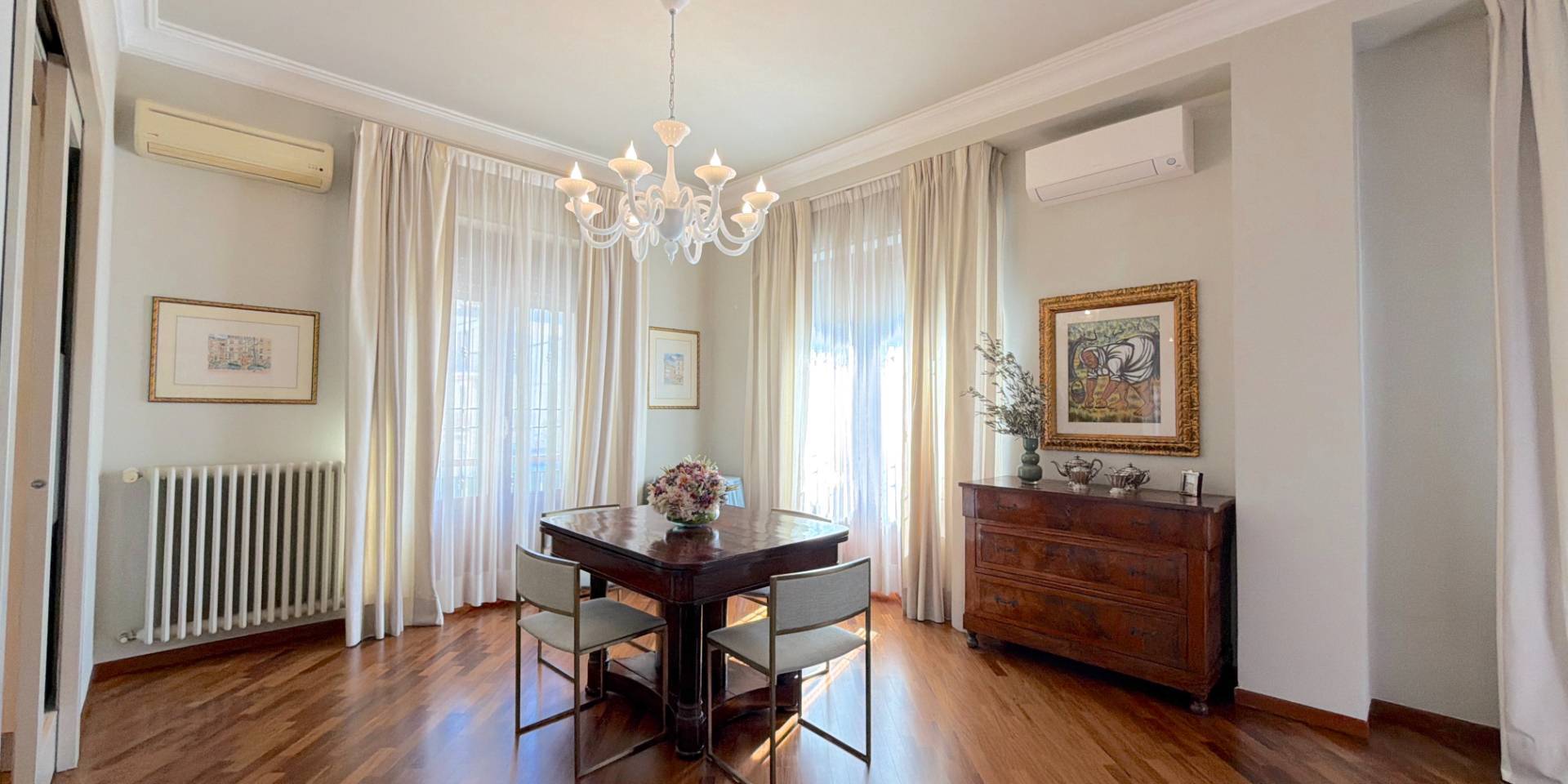 La casa è pronta, senza lavori da mettere in conto: parquet in legno naturale, impianti a norma, climatizzazione in ogni stanza, porte di qualità e bagni rifatti. Una ristrutturazione completa, in stile classico, fatta con criterio e mantenuta in condizioni impeccabili.