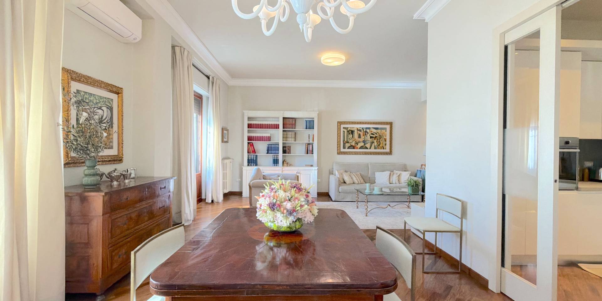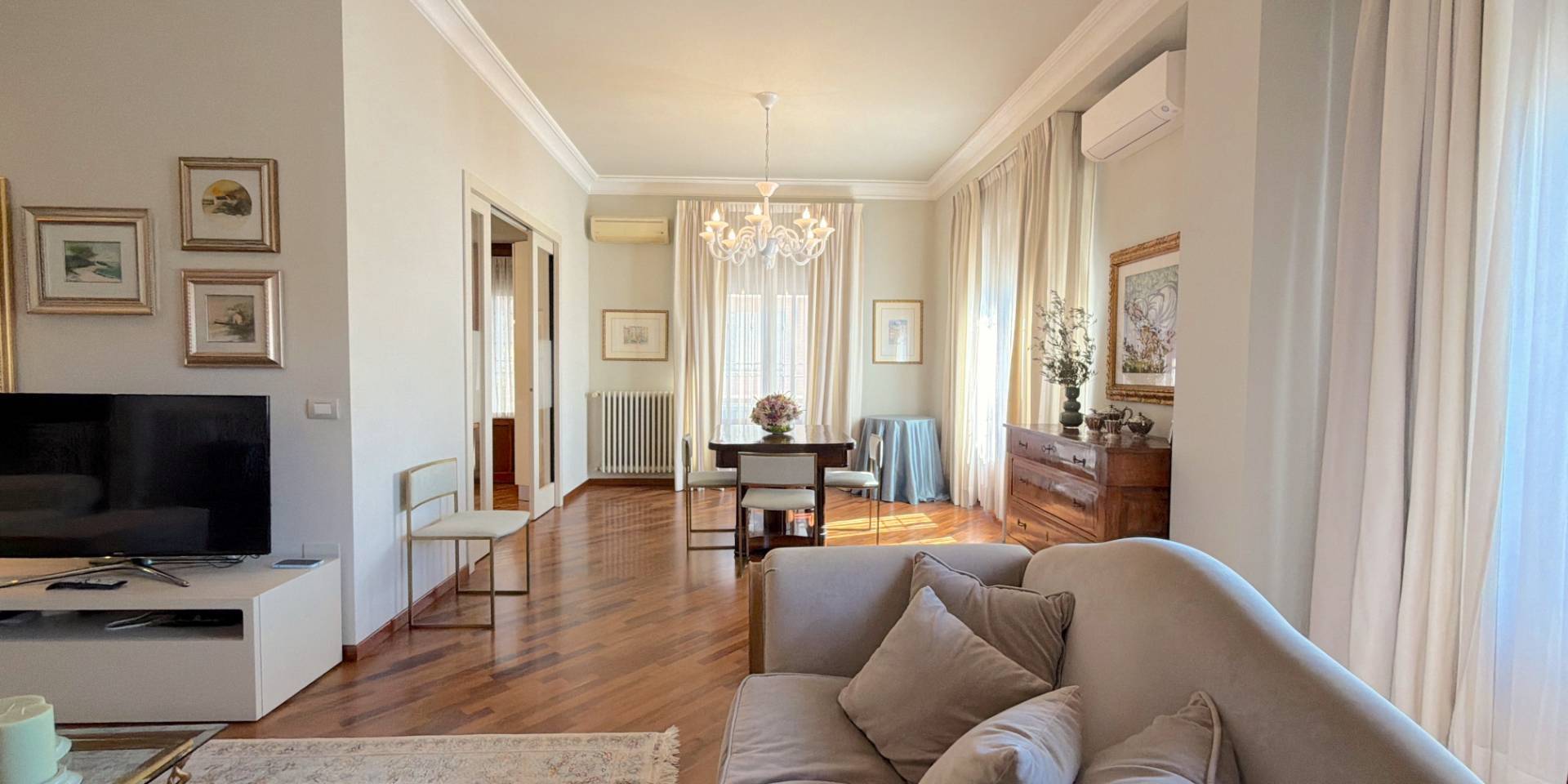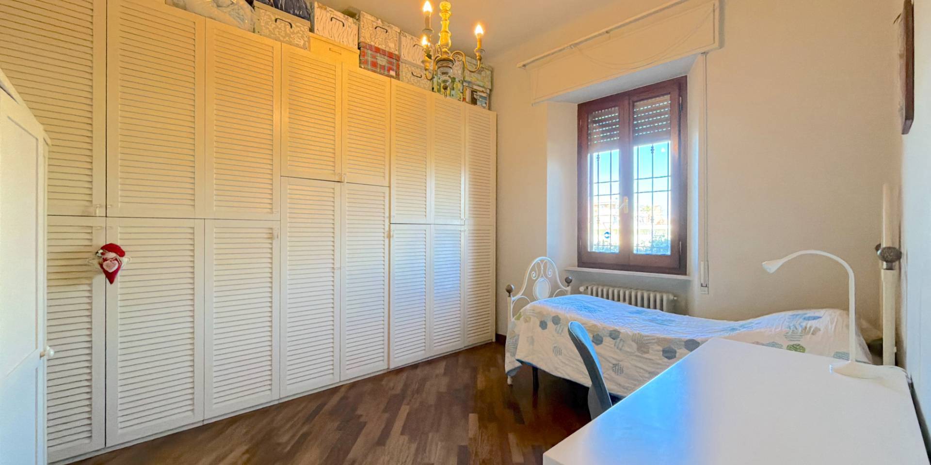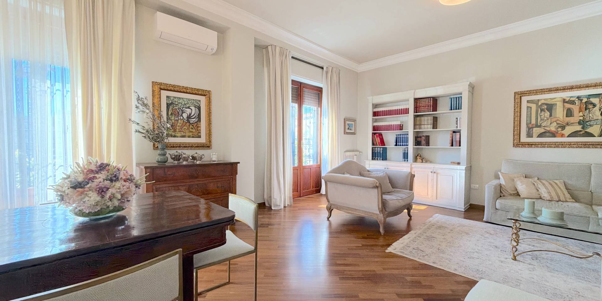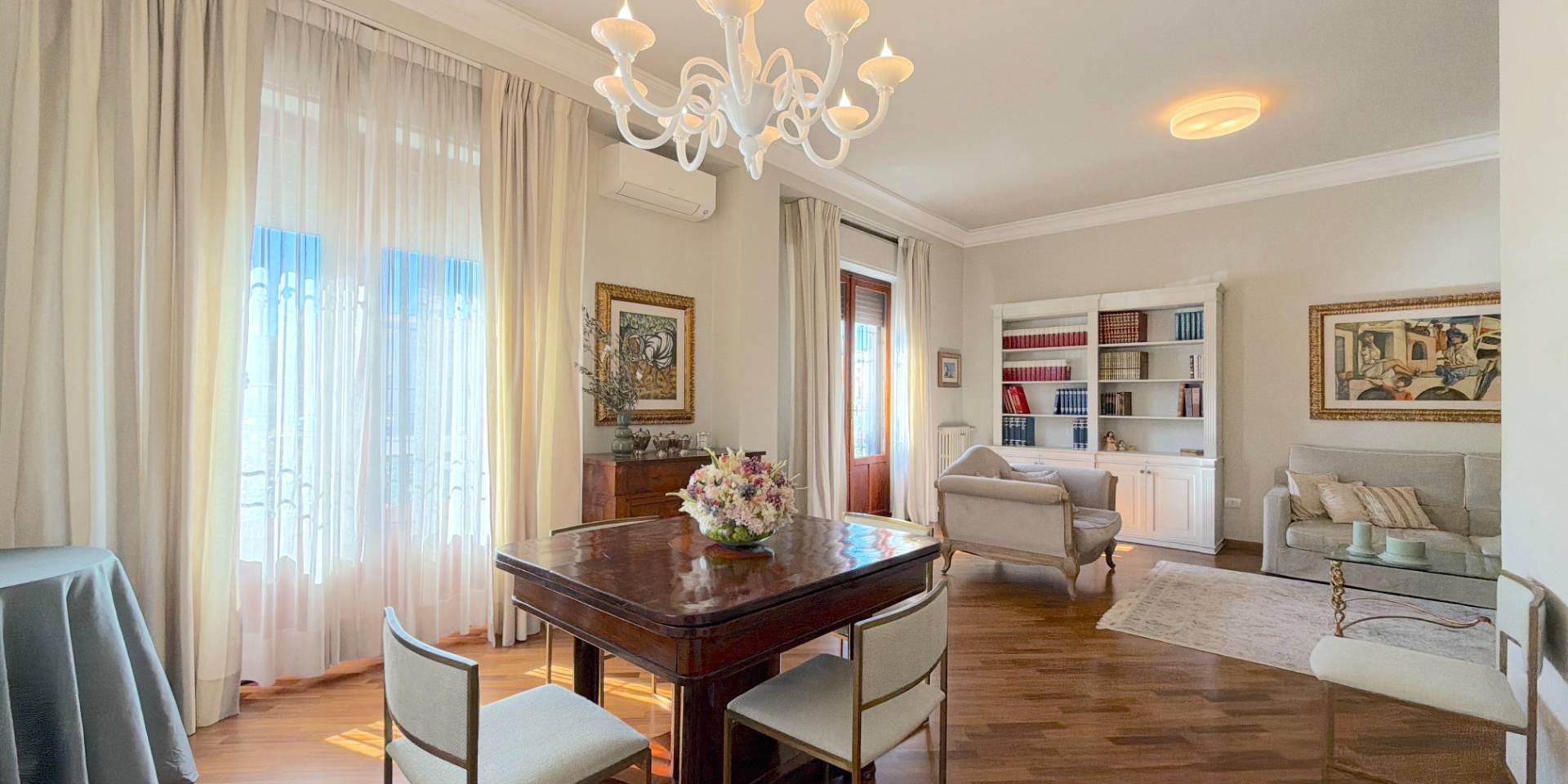 La casa è pronta, senza lavori da mettere in conto: parquet in legno naturale, impianti a norma, climatizzazione in ogni stanza, porte di qualità e bagni rifatti. Una ristrutturazione completa, in stile classico, fatta con criterio e mantenuta in condizioni impeccabili.