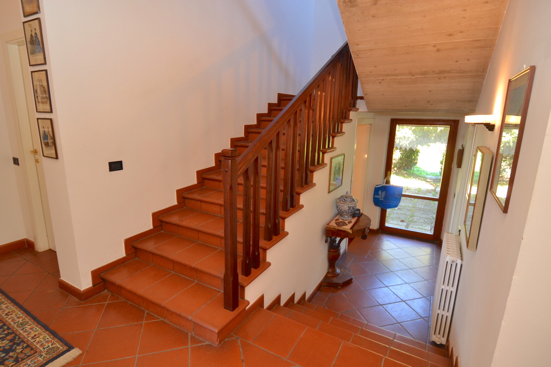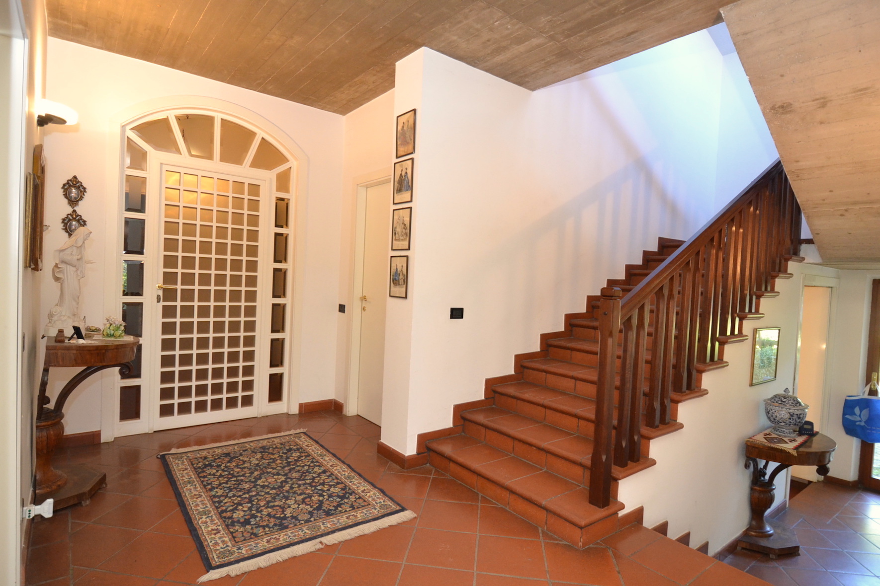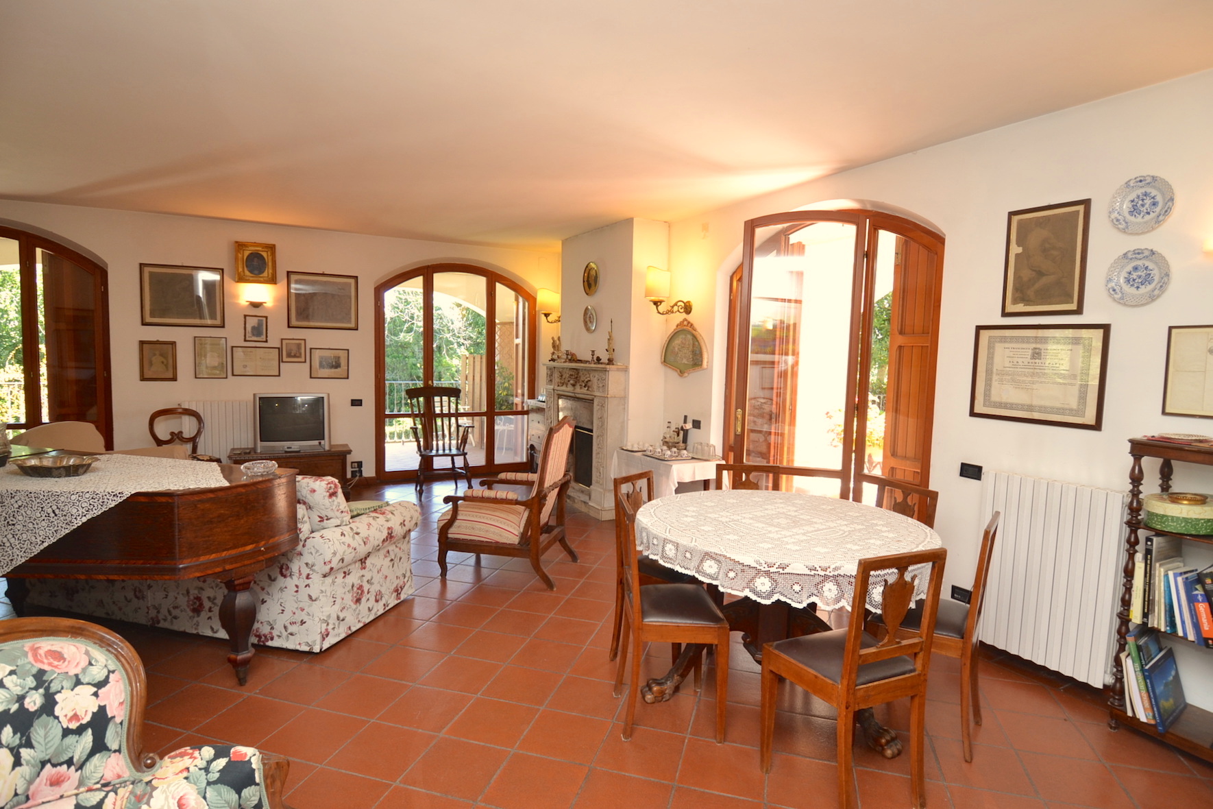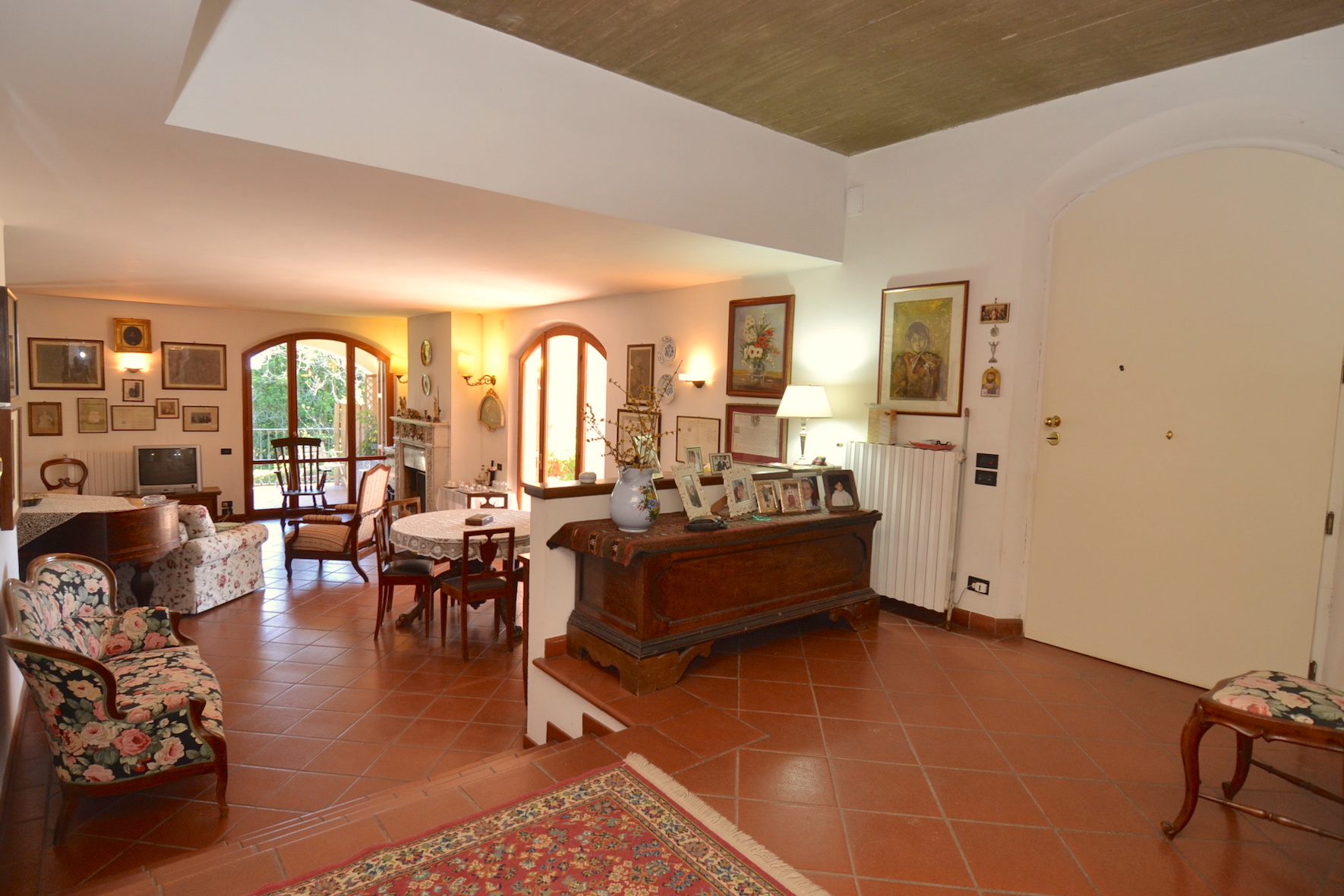 - piano terreno di 215 m² circa, completo di ingresso, ampio salone salotto, grande cucina abitabile, tre camere da letto matrimoniali e due bagni, oltre scala di accesso ai piani superiori. Il piano terreno è fornito di un porticato esterno per soggiornare nella bella stagione.