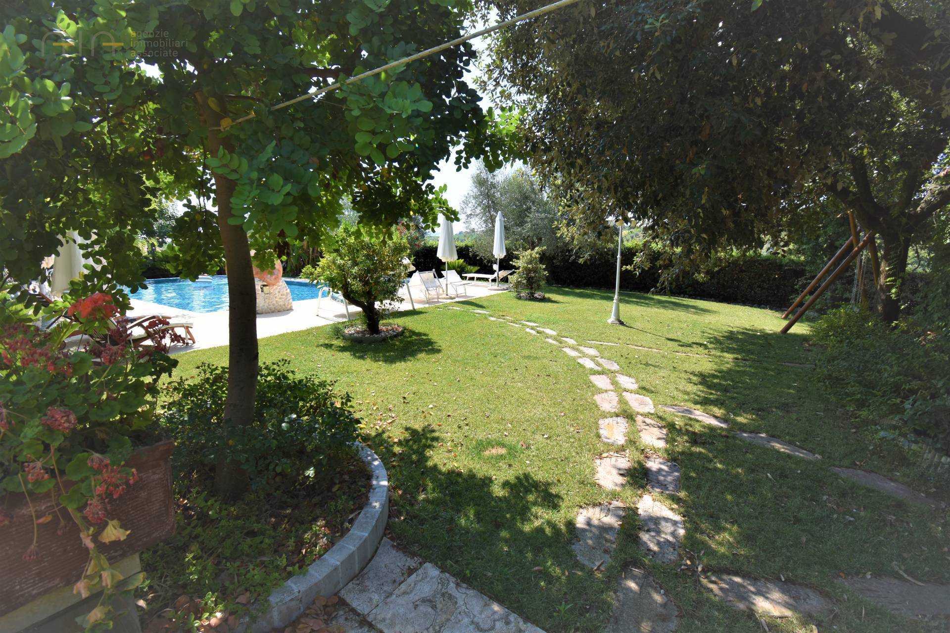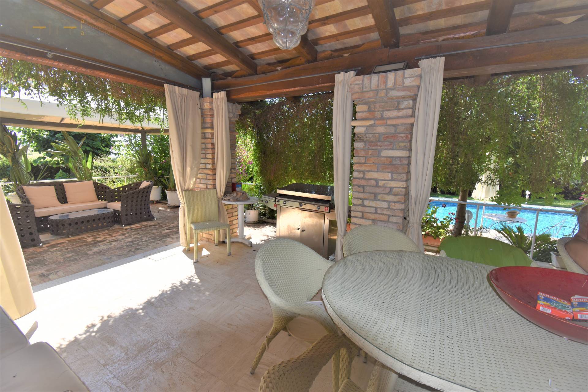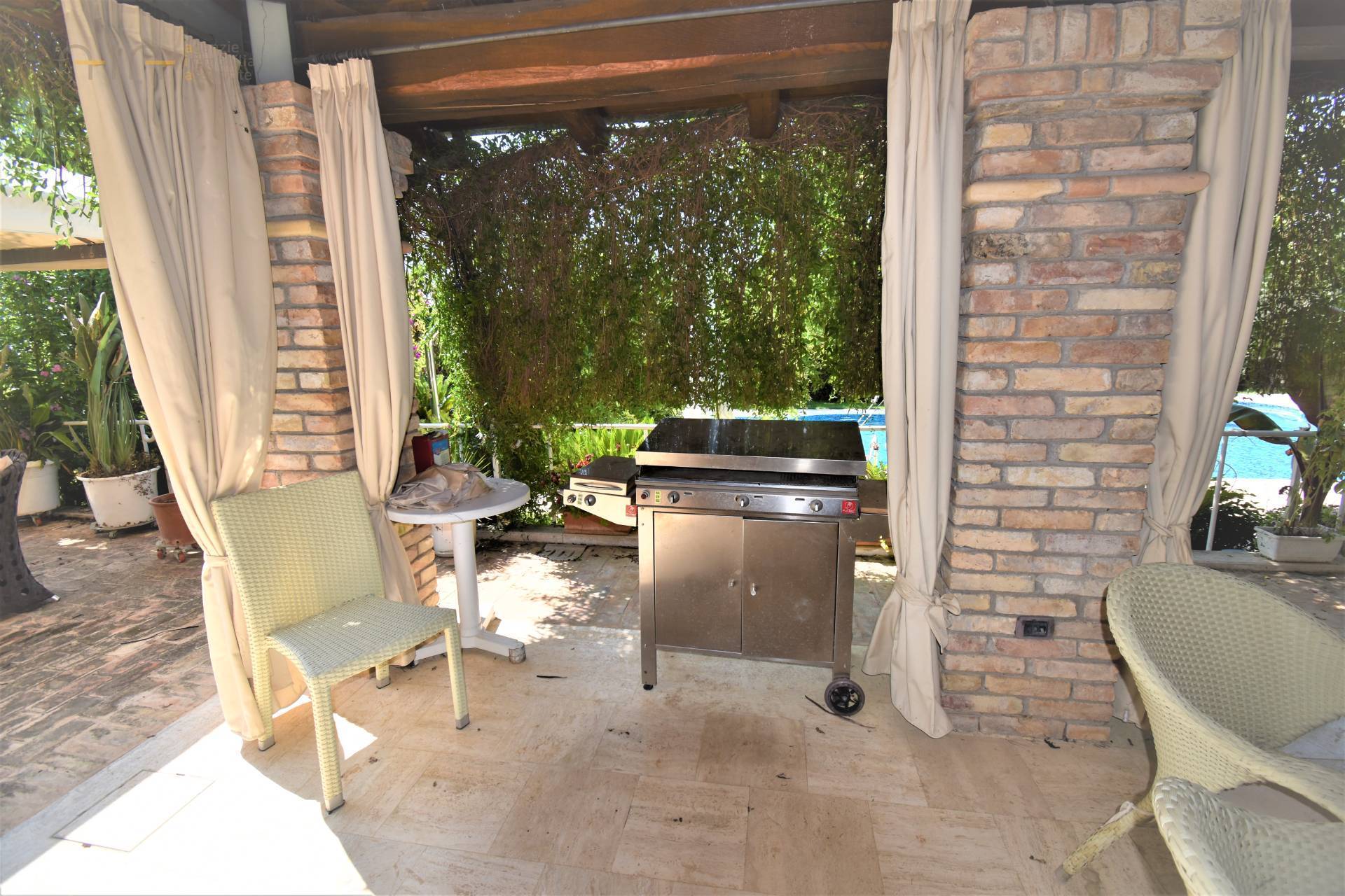 il piano terra di 170 mq circa dispone di un elegante portico, ingresso, sala da pranzo, salotto, studio (con possibilità di ricavare delle camere da letto), cucina abitabile realizzata in muratura , bagno con doccia, due ripostigli e ampio garage con serranda basculante automatizzata. Il portico si sviluppa nella parte retrostante l'edificio ovvero verso la piscina, esposto a sud. Questo spazio è molto utilizzato dalla proprietà in quanto gode di ottima vista, privacy e funge da estensione dell'appartamento stesso.